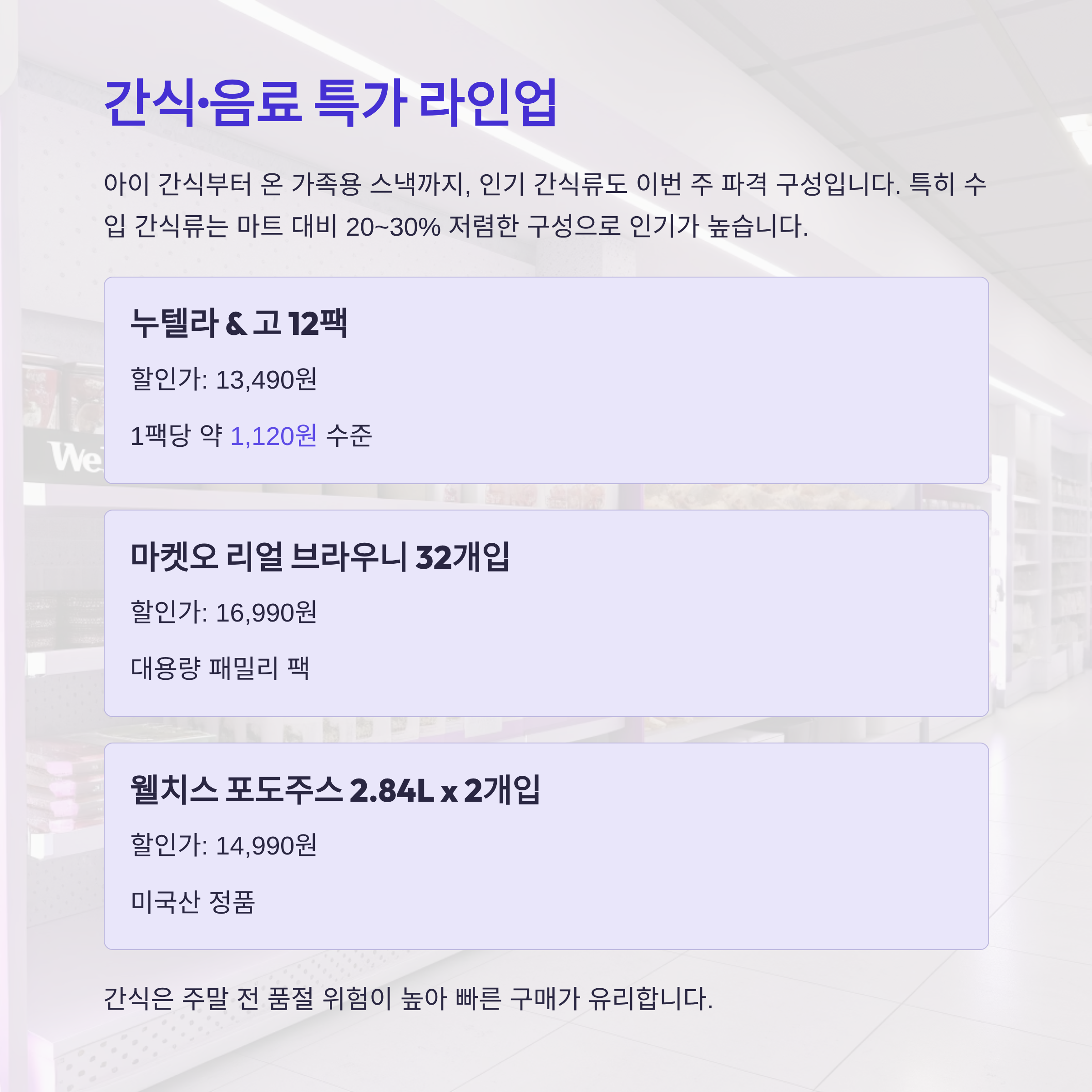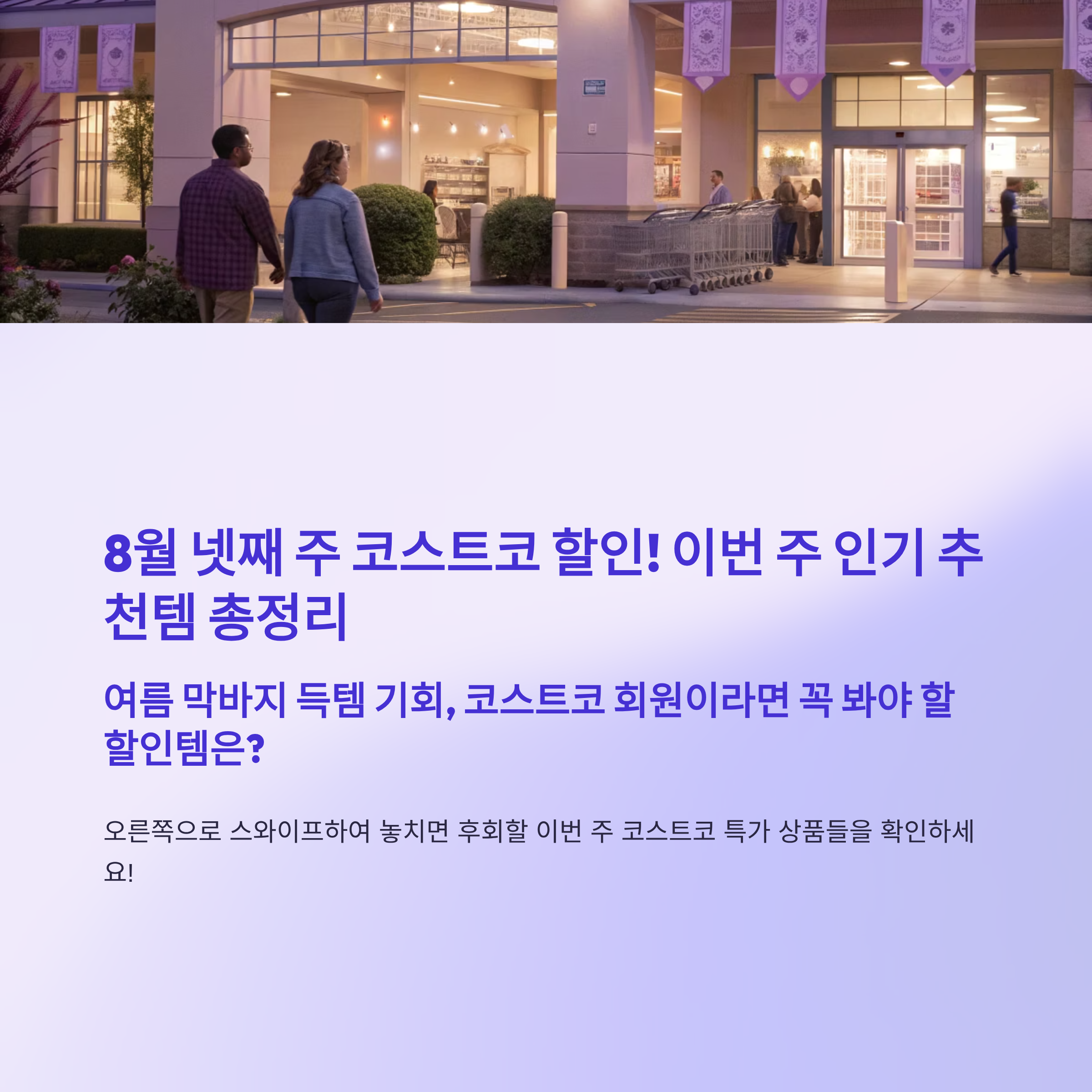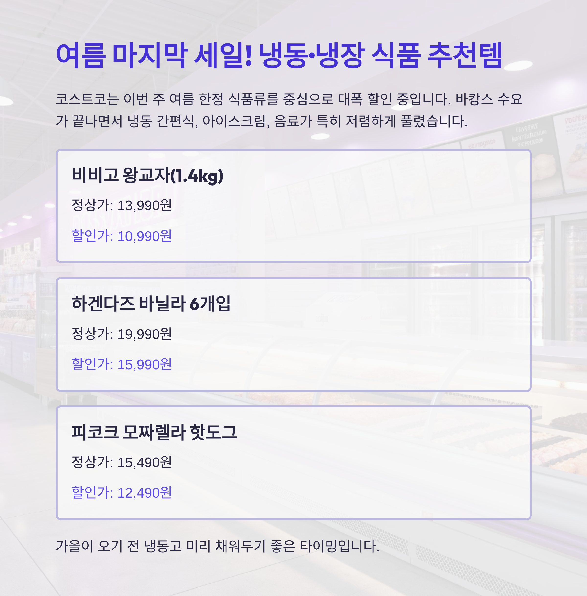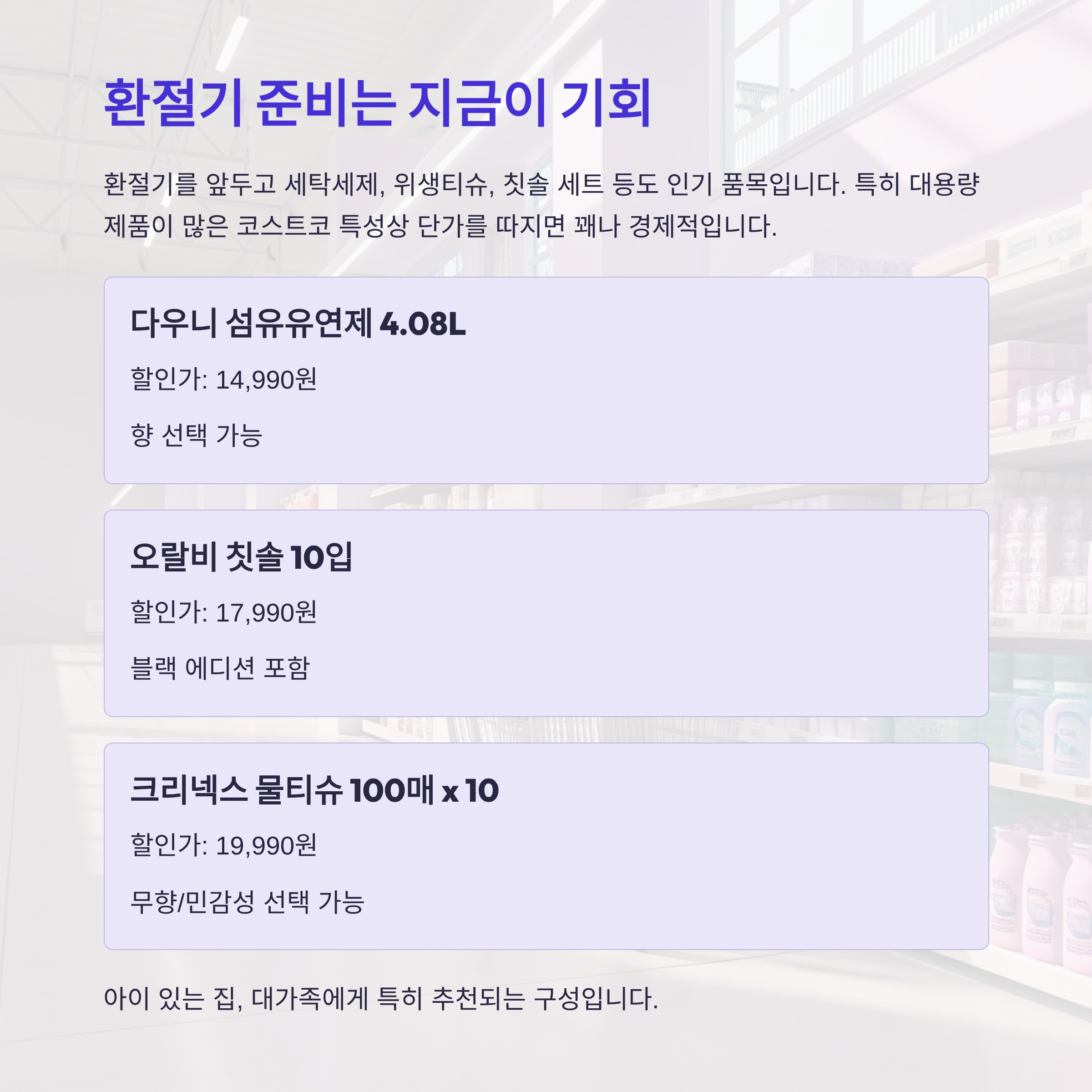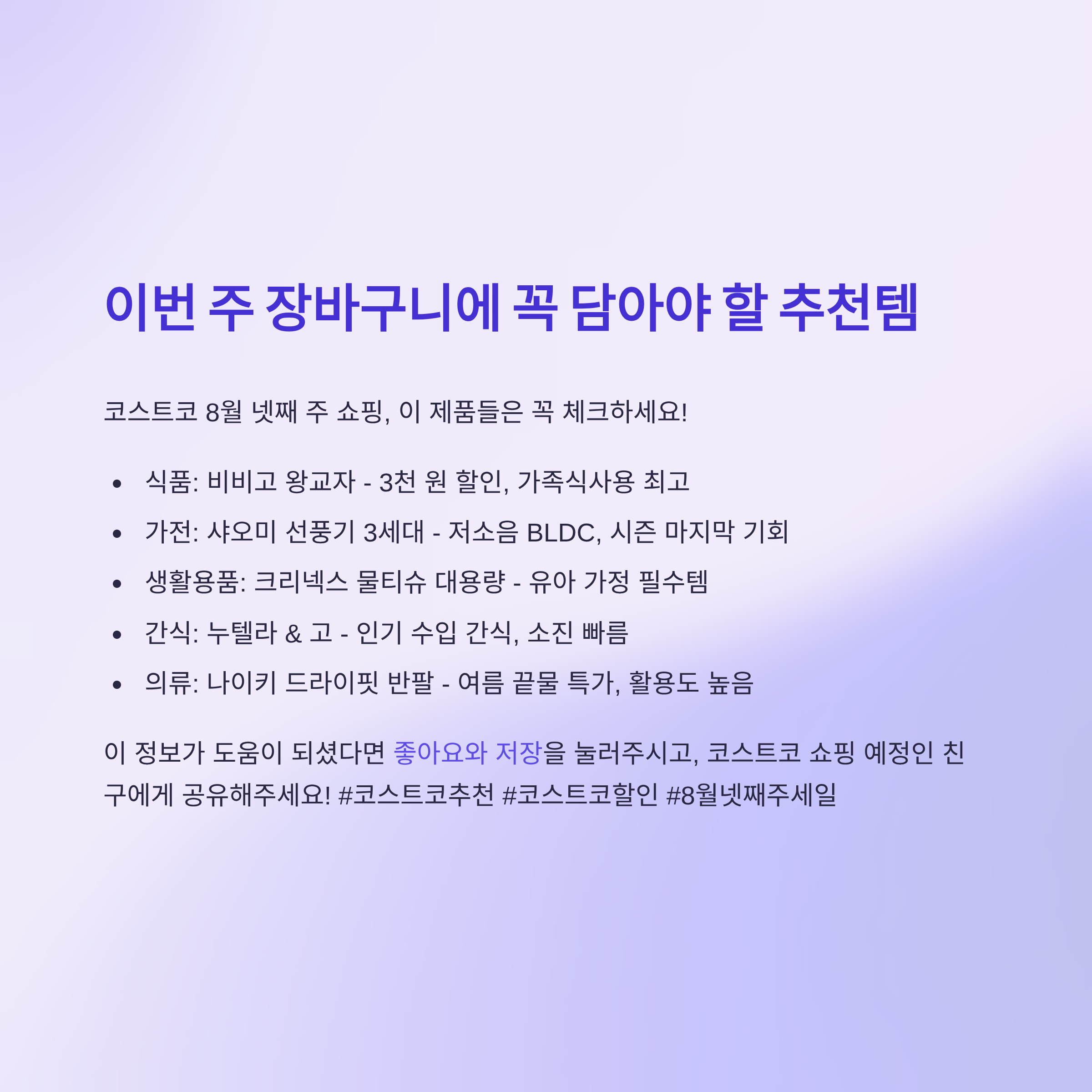 8월 넷째 주 코스트코는 여름 시즌 마감과 함께 식품, 가전, 의류, 생활용품 등 다양한 카테고리에서 초특가 할인 행사를 진행 중입니다. 비비고 왕교자, 샤오미 선풍기, 크리넥스 물티슈, 누텔라 간식 등 인기 상품들이 대거 할인되며, 클리어런스 세일도 시작돼 지금이 득템 적기입니다. 이번 주 코스트코 추천템을 미리 확인하고 알뜰한 장보기 하세요.