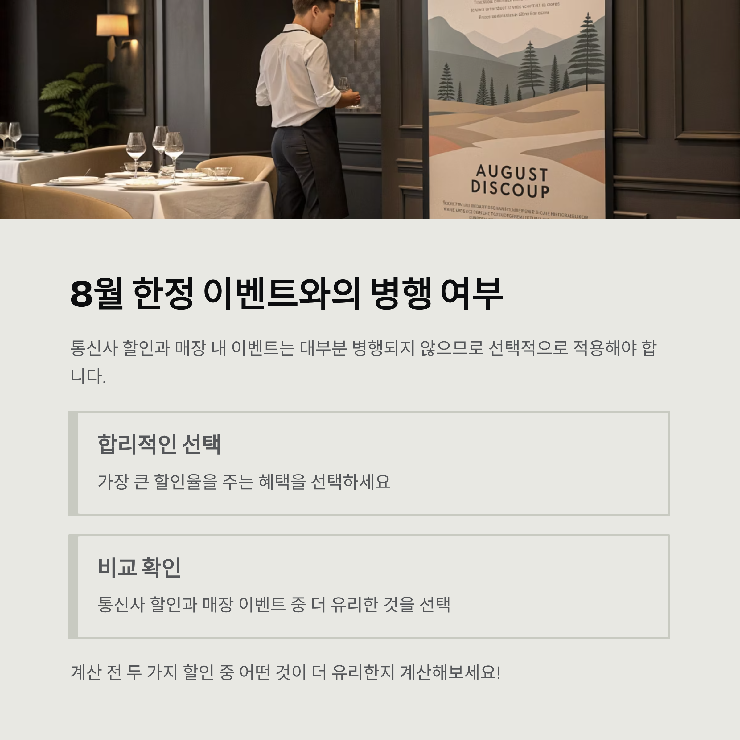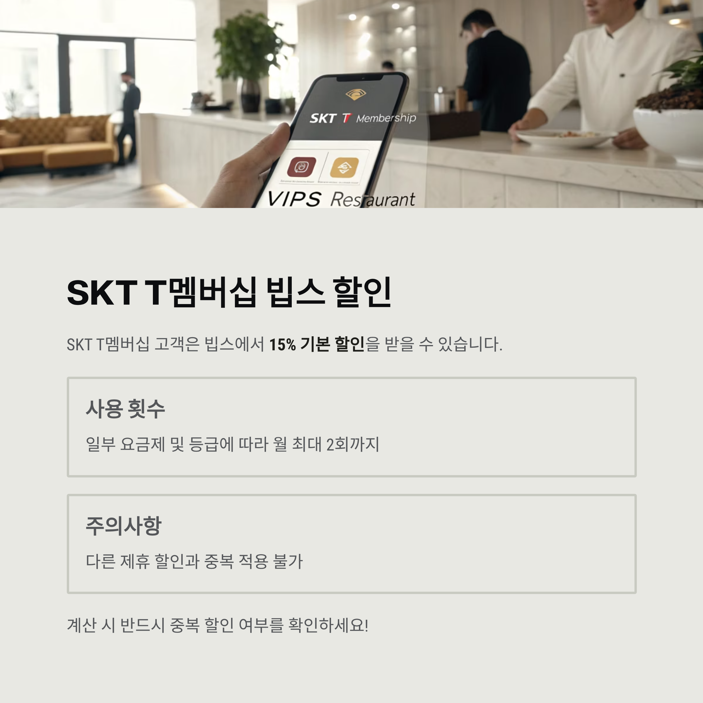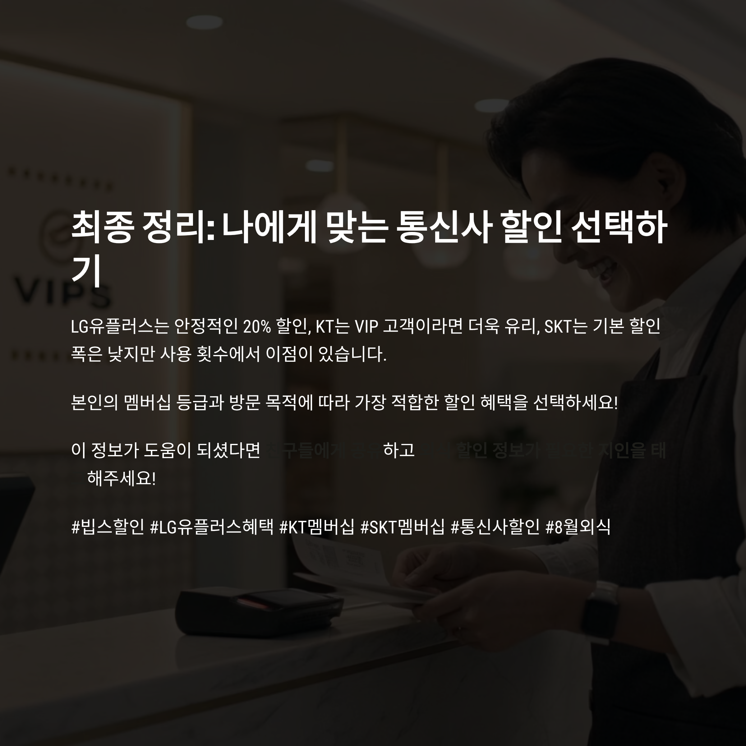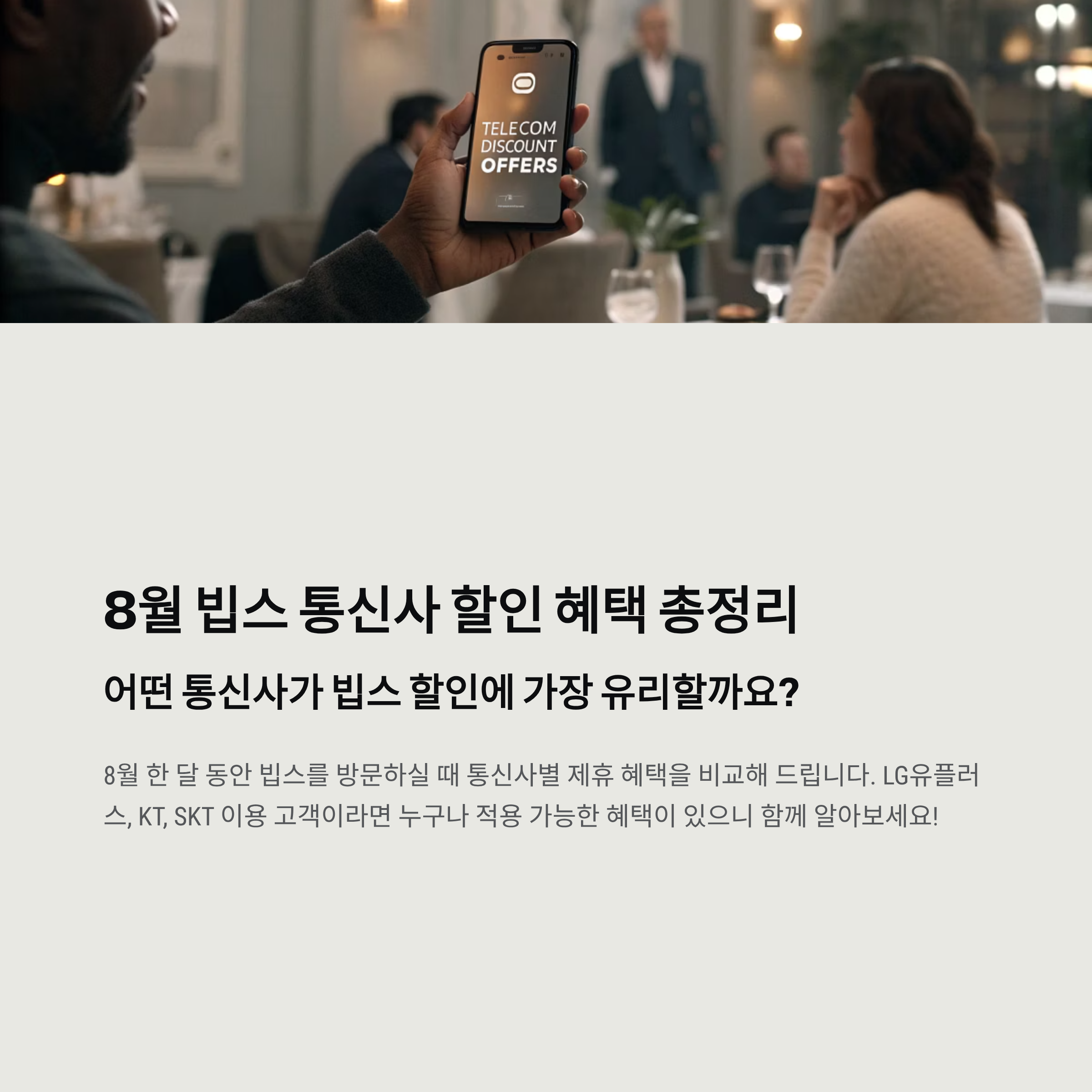 8월 빕스 방문 계획 있으신가요? LG유플러스는 최대 20%, KT는 VIP 고객 기준 월 1회 20%, SKT는 기본 15%까지 할인 혜택을 제공합니다. 통신사별 조건과 등급에 따라 차이가 크니, 이번 글에서 가장 유리한 선택지를 확인해보세요.