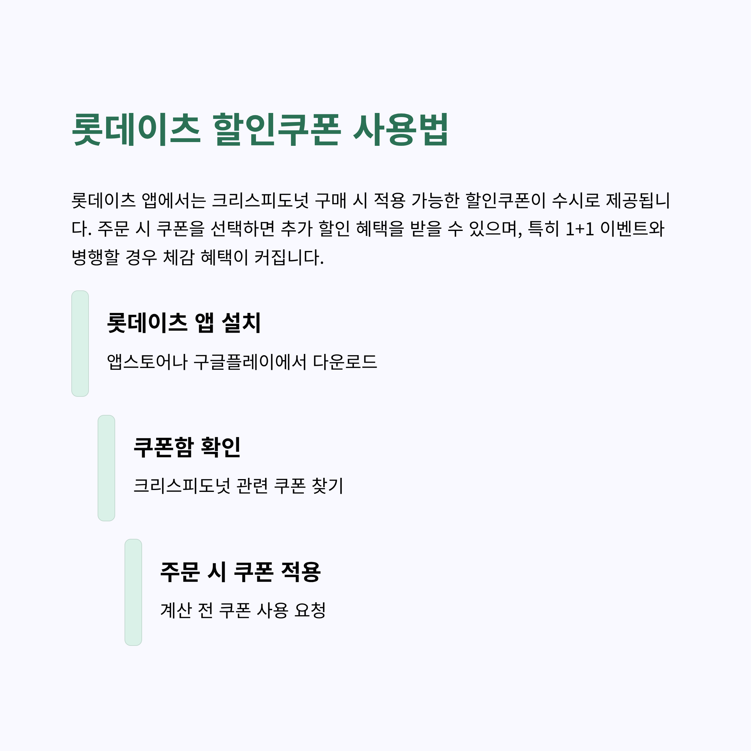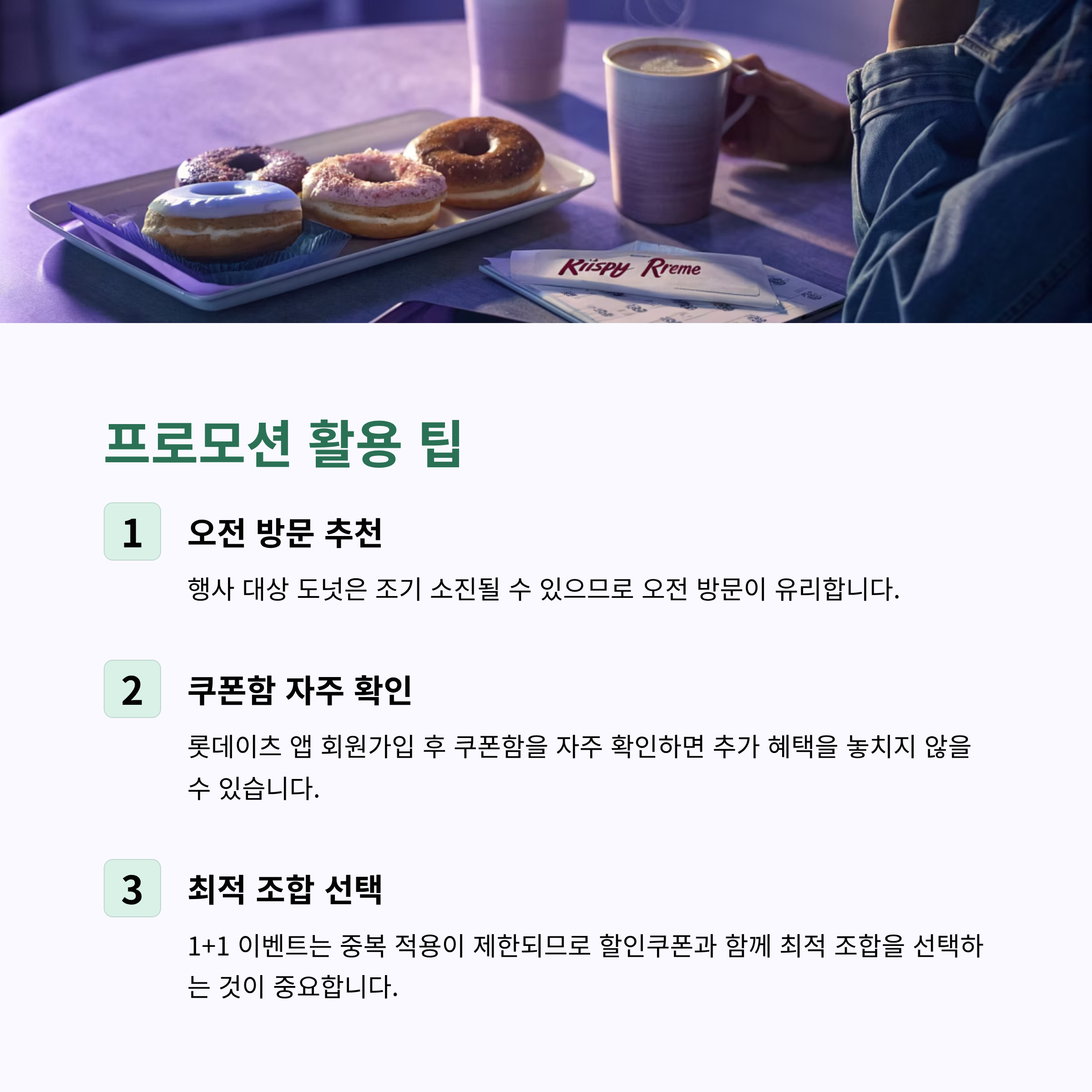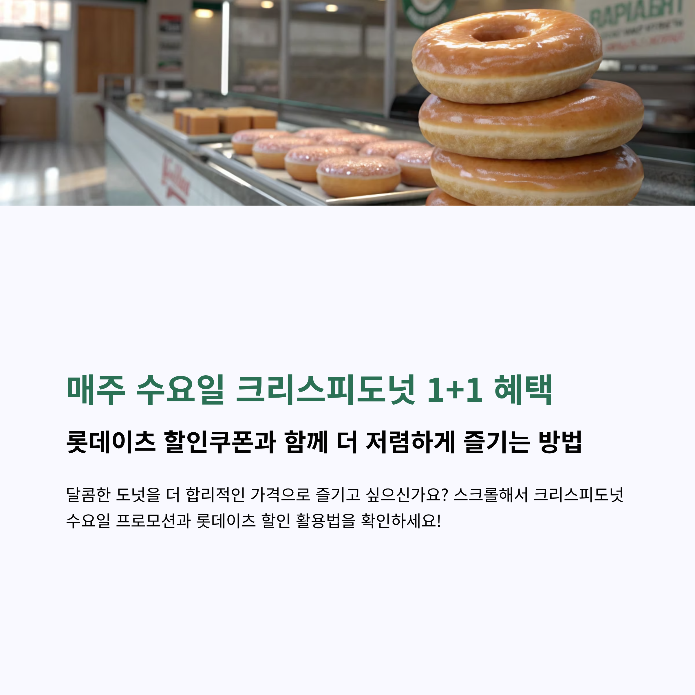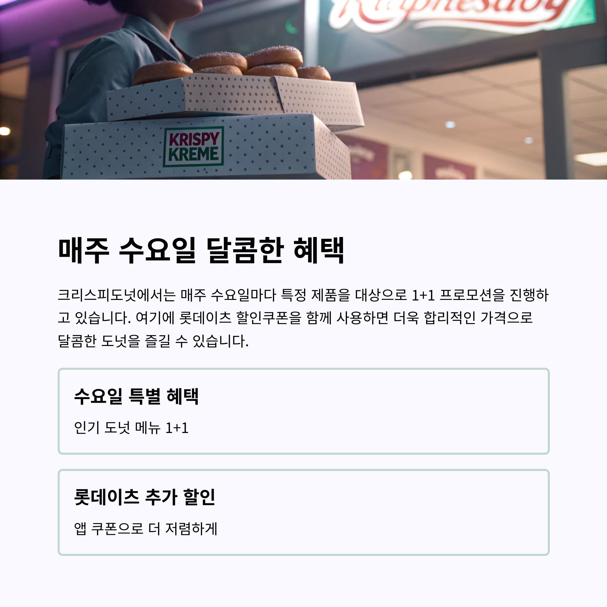 매주 수요일, 달콤한 도넛을 두 배로 즐길 수 있는 크리스피도넛 1+1 프로모션이 열립니다. 여기에 롯데이츠 할인쿠폰까지 더하면 가격 부담 없이 더욱 알차게 즐길 수 있는 꿀혜택을 놓치지 마세요.