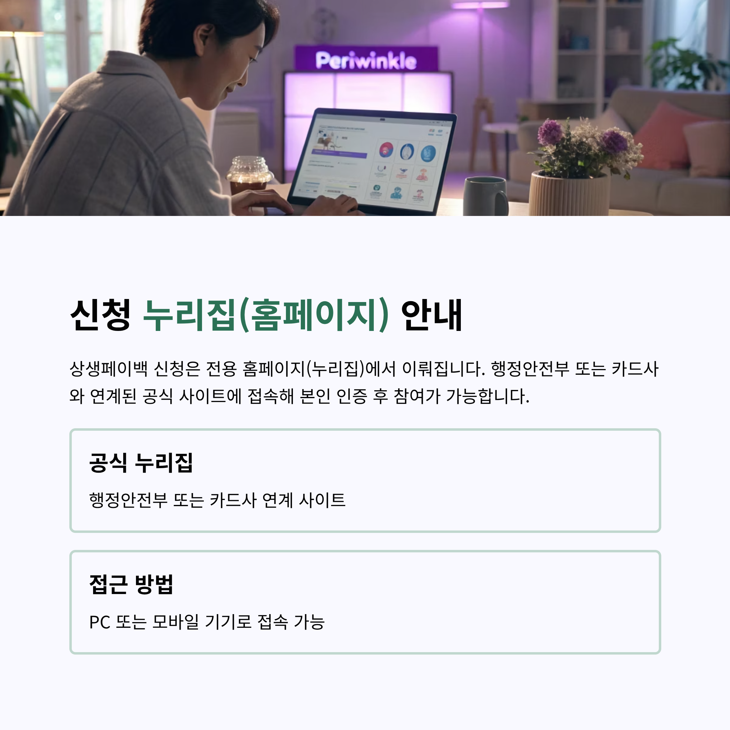 2025년에도 카드 사용만으로 환급 혜택을 받을 수 있는 상생페이백 이벤트가 진행됩니다. 전용 누리집에서 간단히 신청하면 카드사 포인트나 현금으로 환급받을 수 있으니 기간 내 꼭 참여해 보세요.
