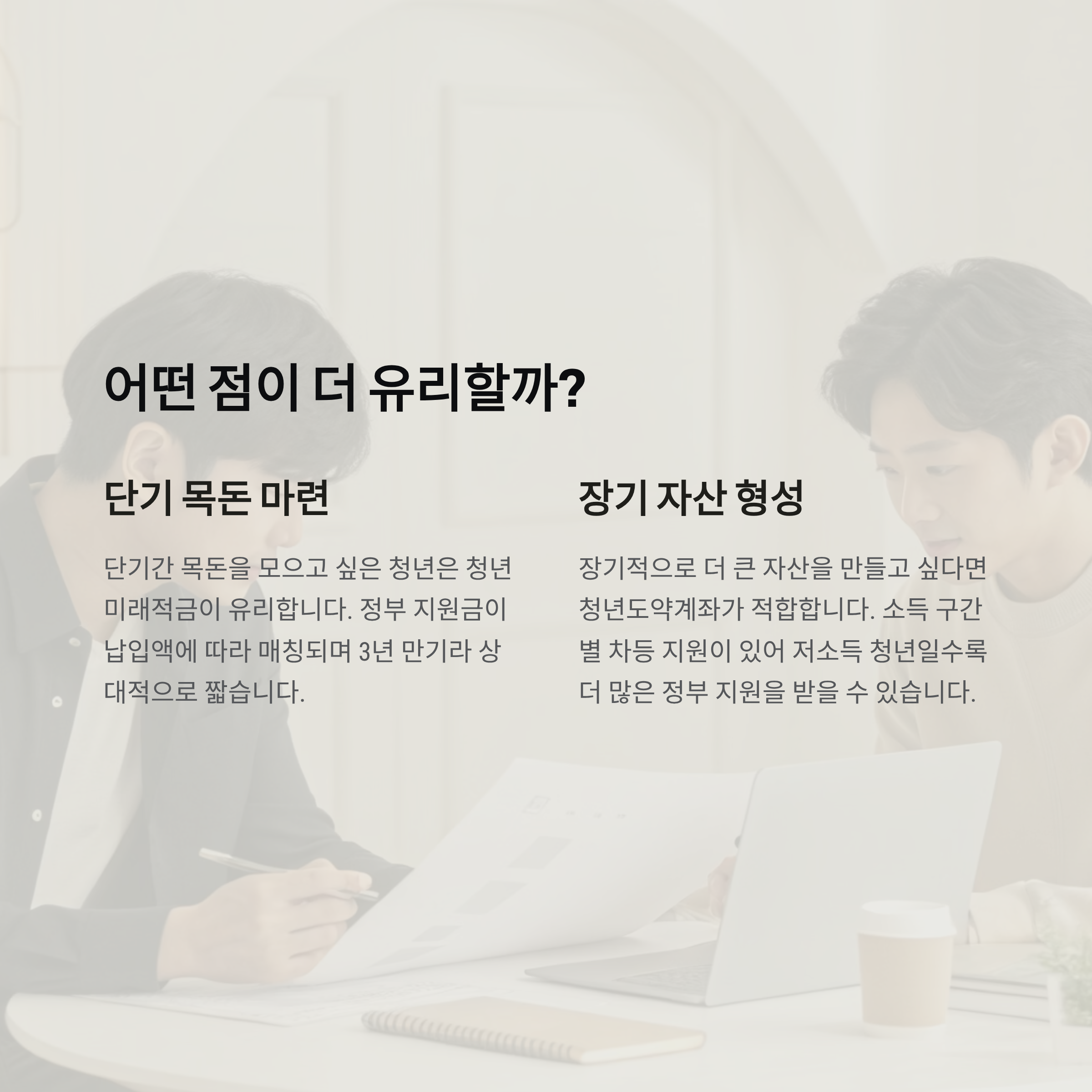 청년이라면 반드시 알아야 할 자산 형성 제도, 바로 청년 미래적금과 청년도약계좌입니다. 두 상품은 가입 조건과 정부 지원 방식, 만기 기간에서 차이가 있어 개인 상황에 따라 선택이 달라질 수 있습니다.