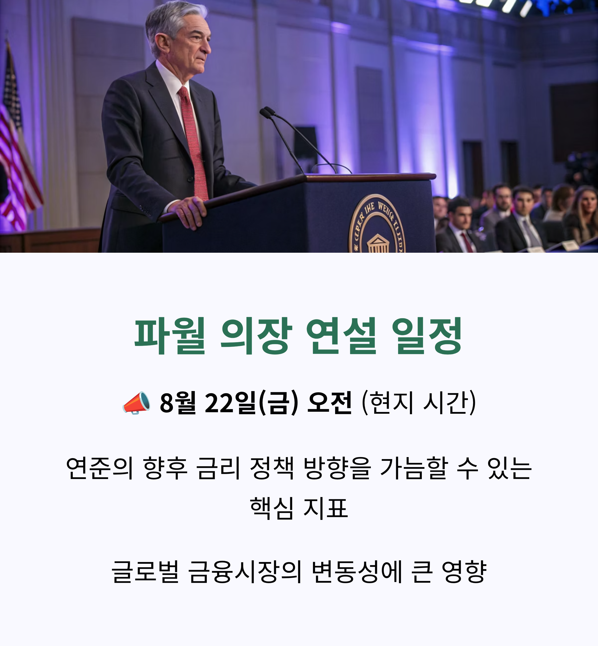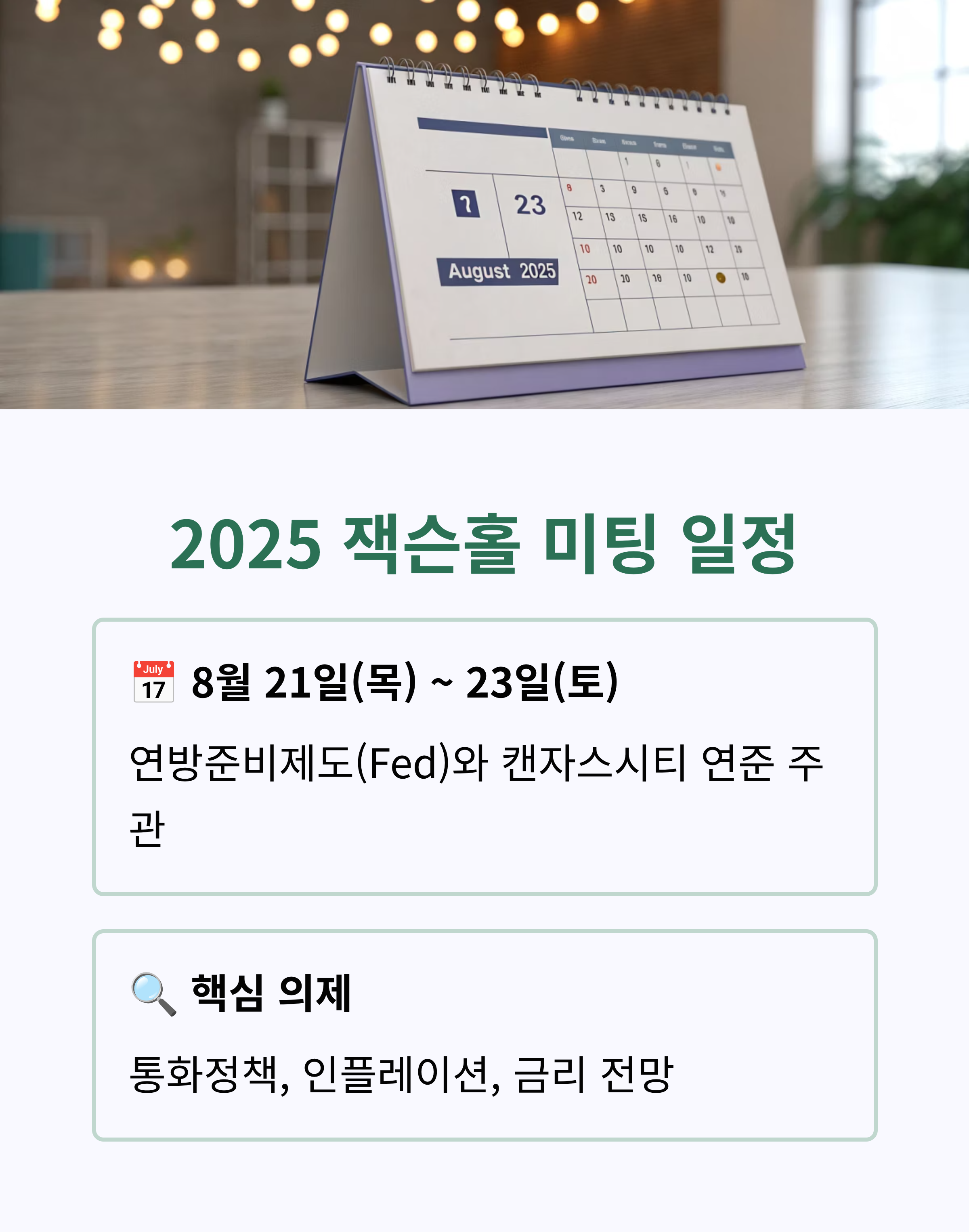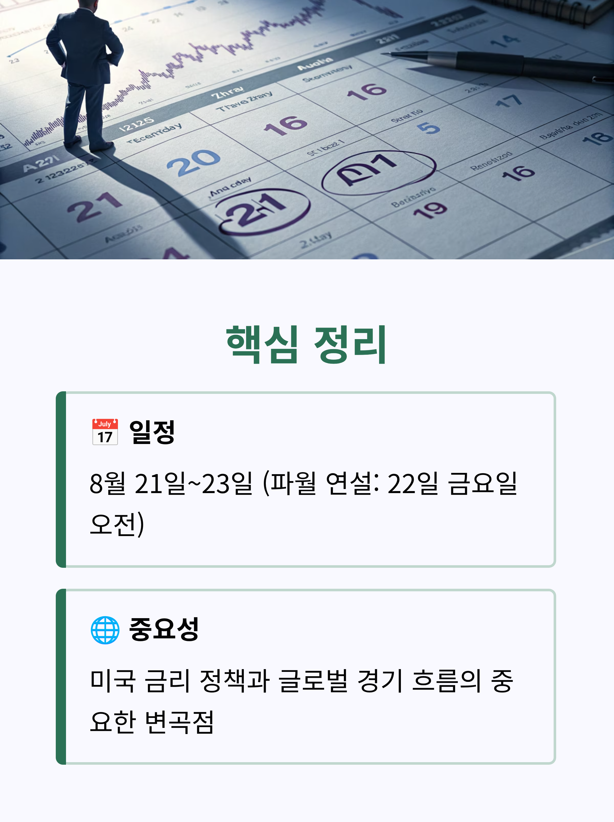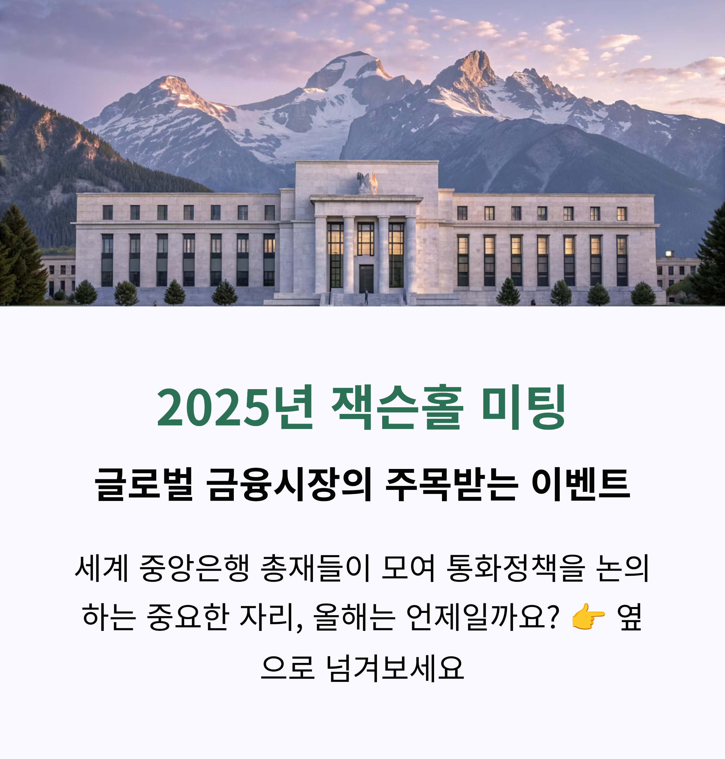 글로벌 금융시장이 촉각을 곤두세우는 2025 잭슨홀 미팅이 8월 21일부터 열립니다. 특히 파월 의장의 22일 기조 연설은 향후 금리 정책과 세계 경제 흐름을 가늠할 핵심 이벤트로 투자자들의 관심이 집중됩니다.