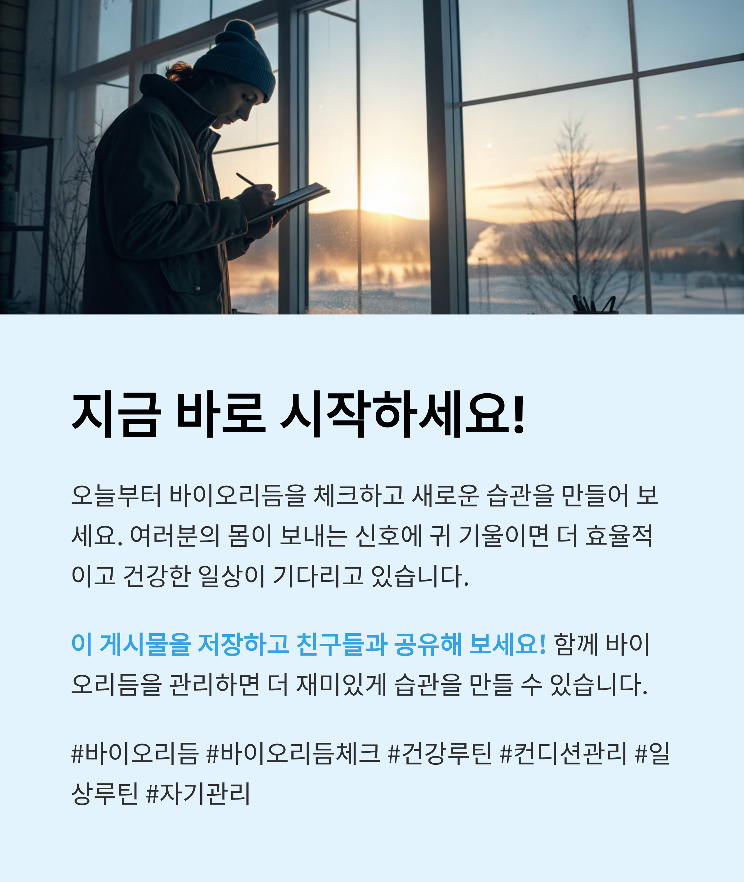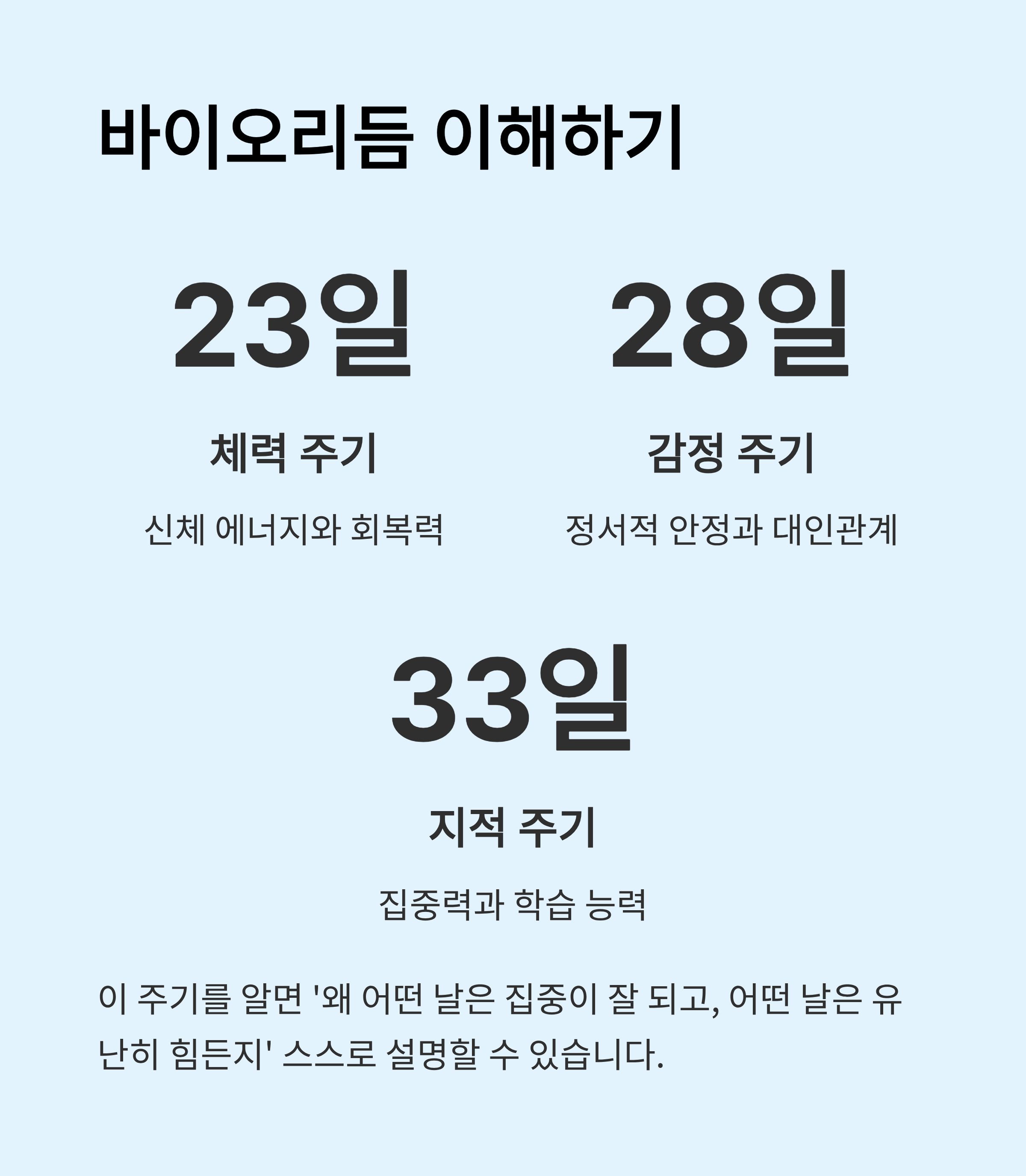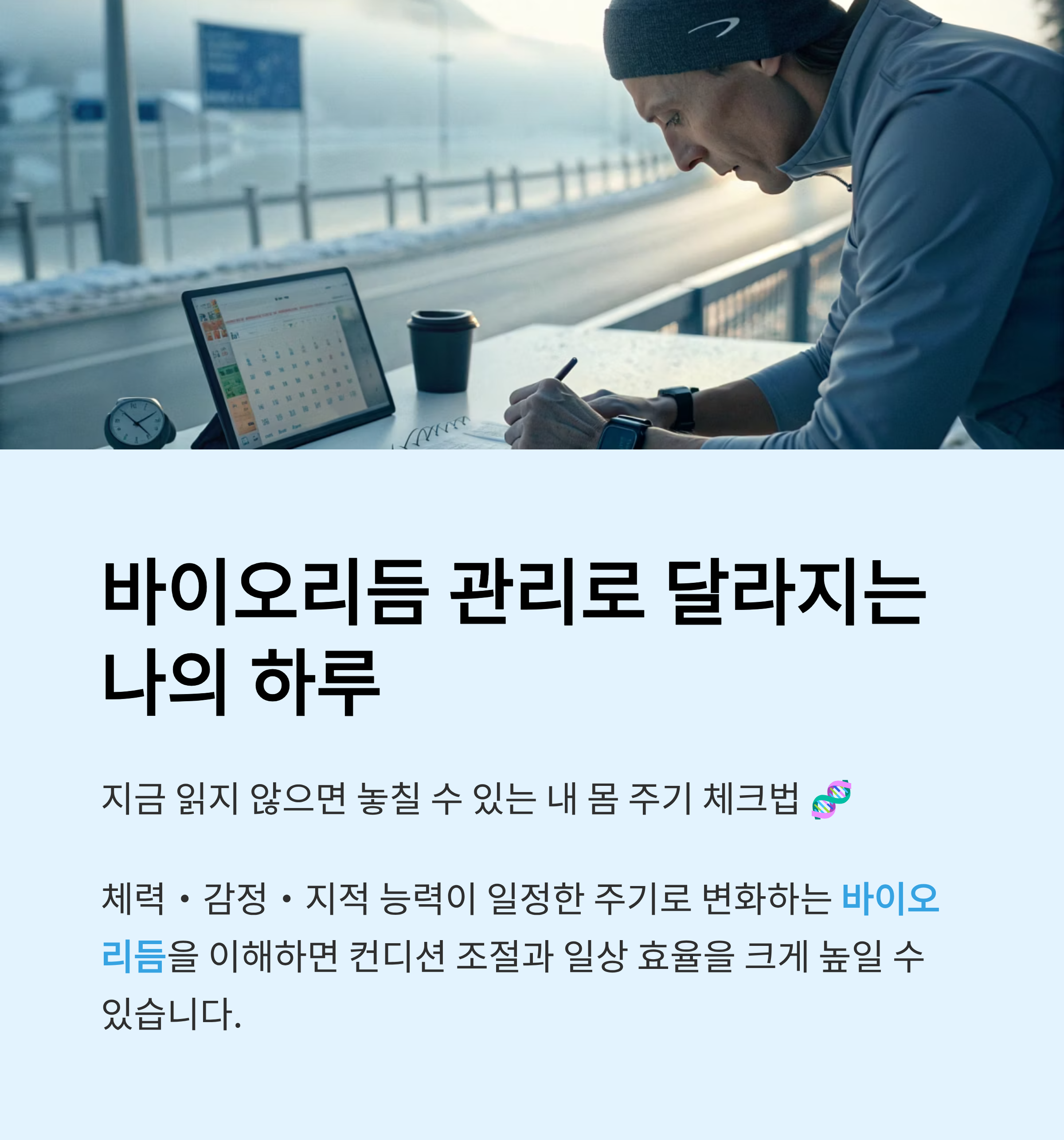 매일 같은 하루 같아 보여도 사실 우리 몸은 늘 다른 신호를 보냅니다. 🧬 바이오리듬을 이해하고 관리하면 컨디션과 집중력을 높여 더 효율적인 하루를 만들 수 있습니다. 지금 바로 내 몸의 리듬을 체크해보세요!