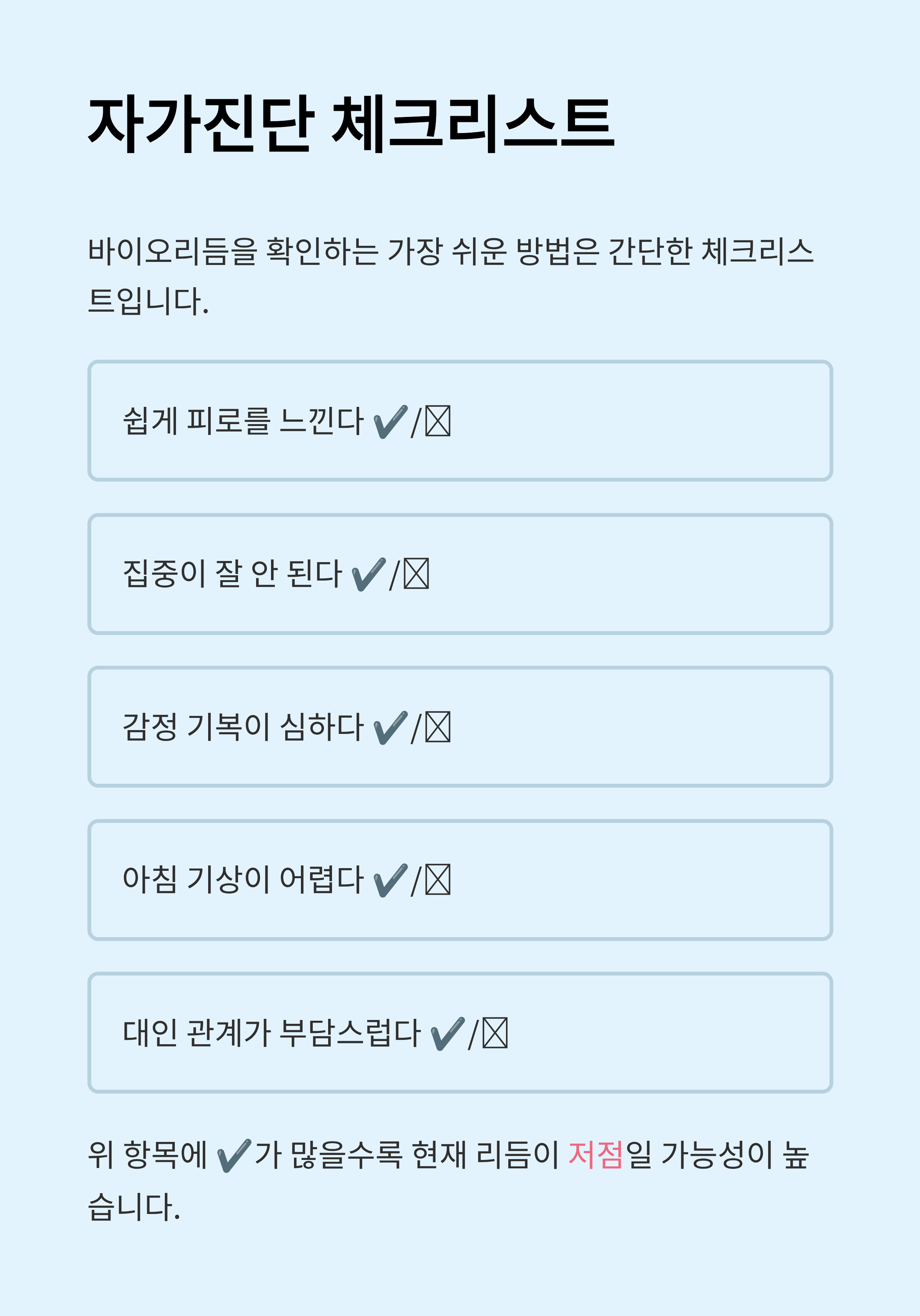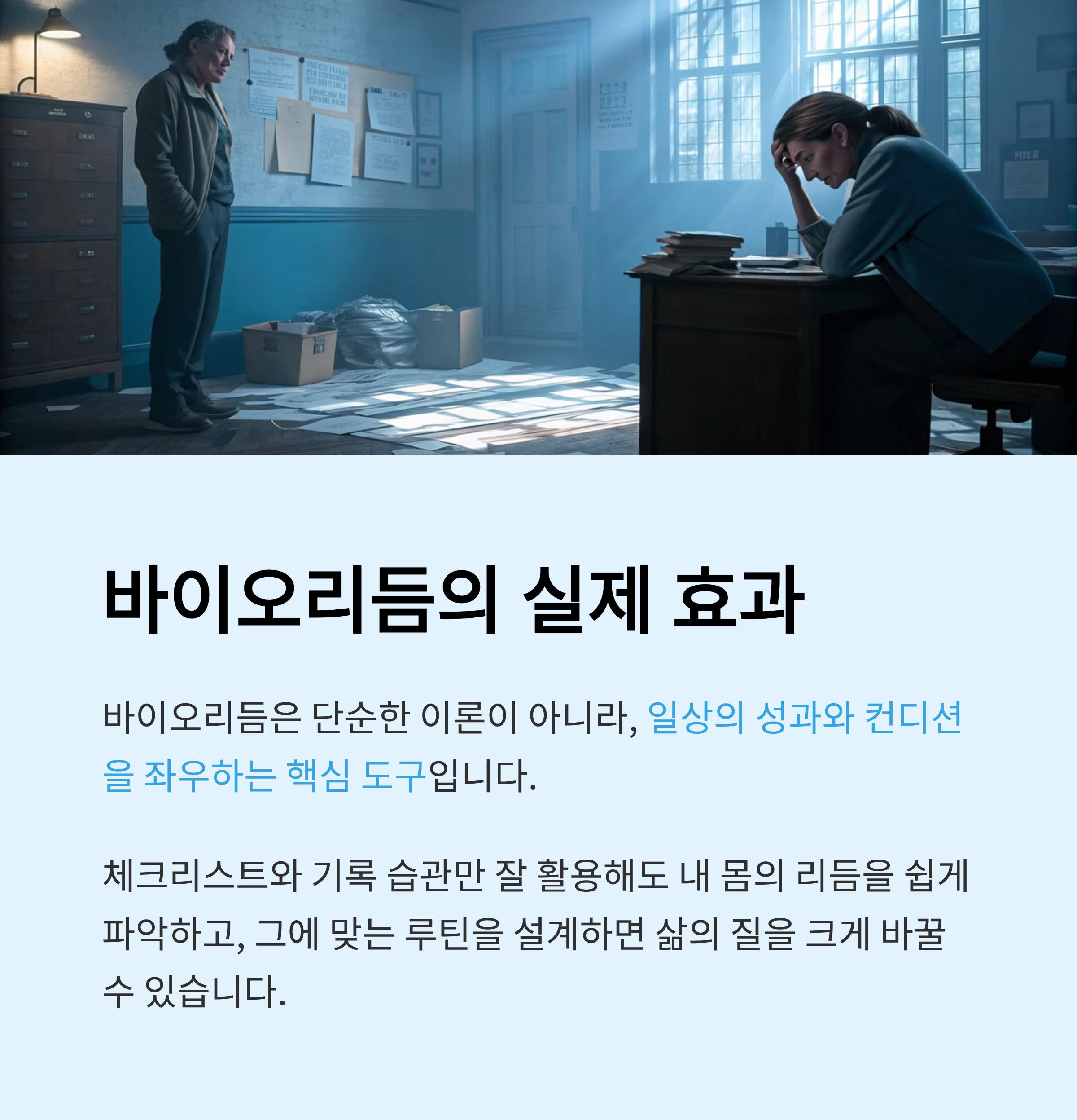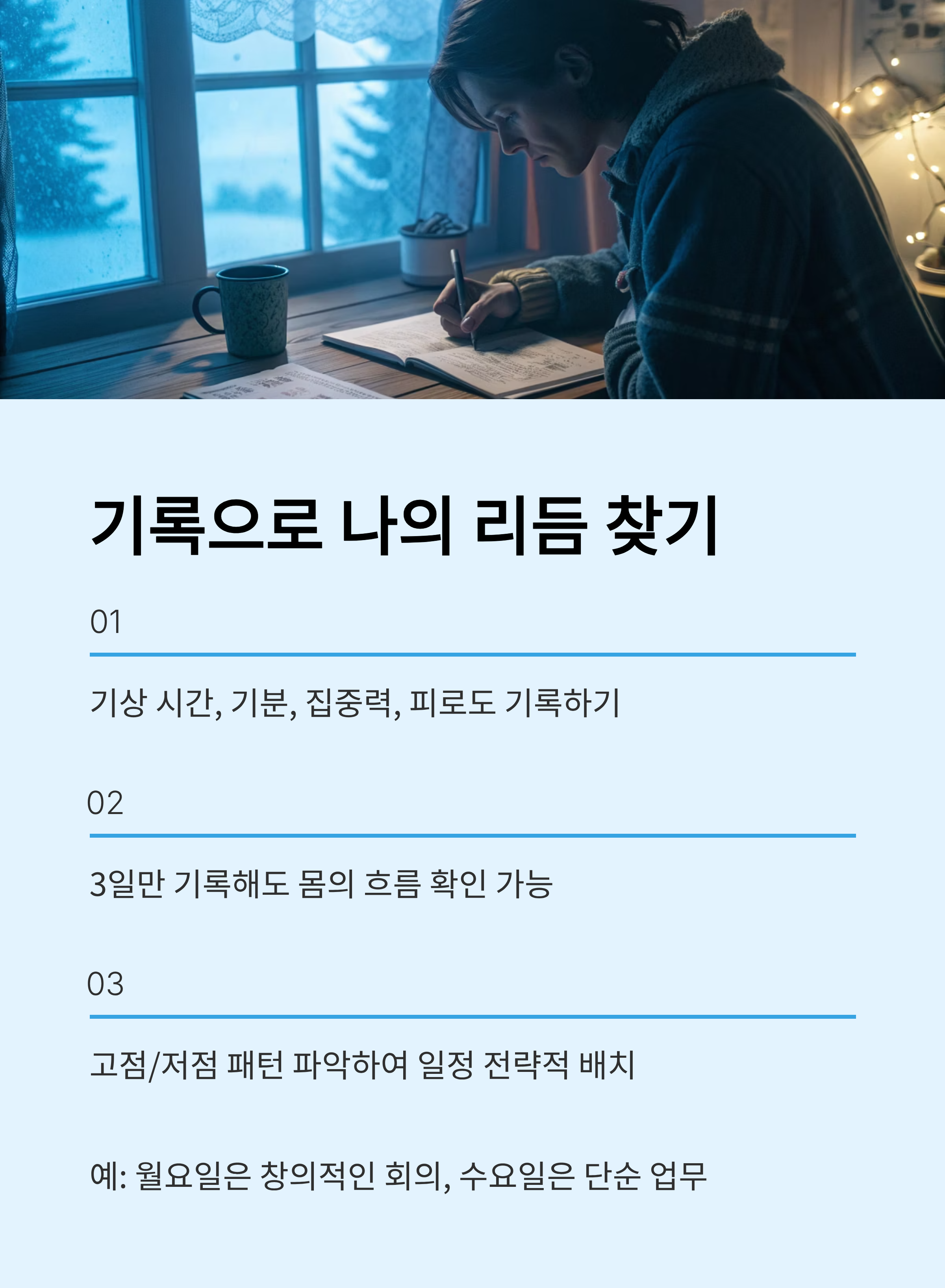 매일 같은 하루 같아 보여도 사실 우리 몸은 늘 다른 신호를 보냅니다. 🧬 바이오리듬을 이해하고 관리하면 컨디션과 집중력을 높여 더 효율적인 하루를 만들 수 있습니다. 지금 바로 내 몸의 리듬을 체크해보세요!