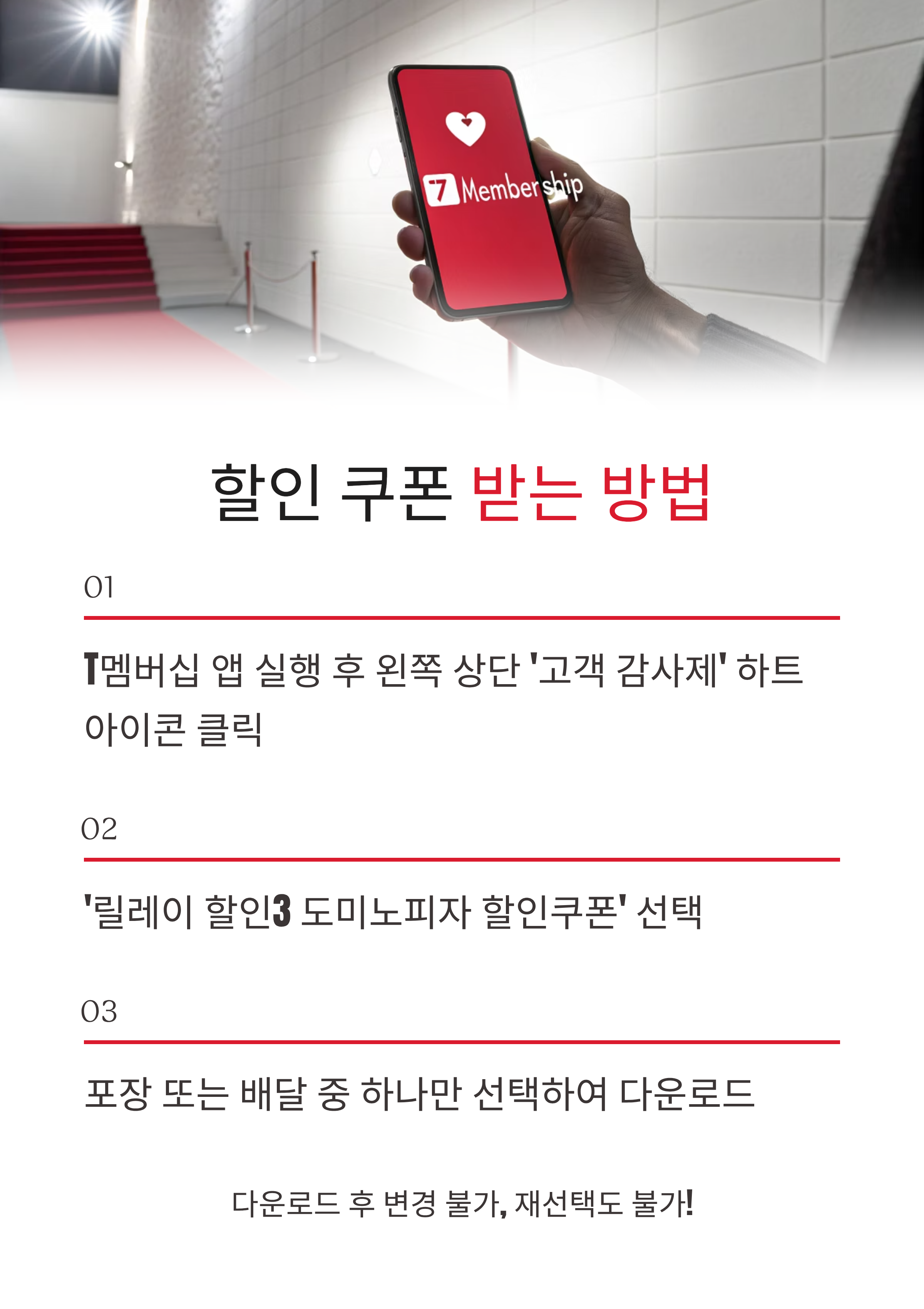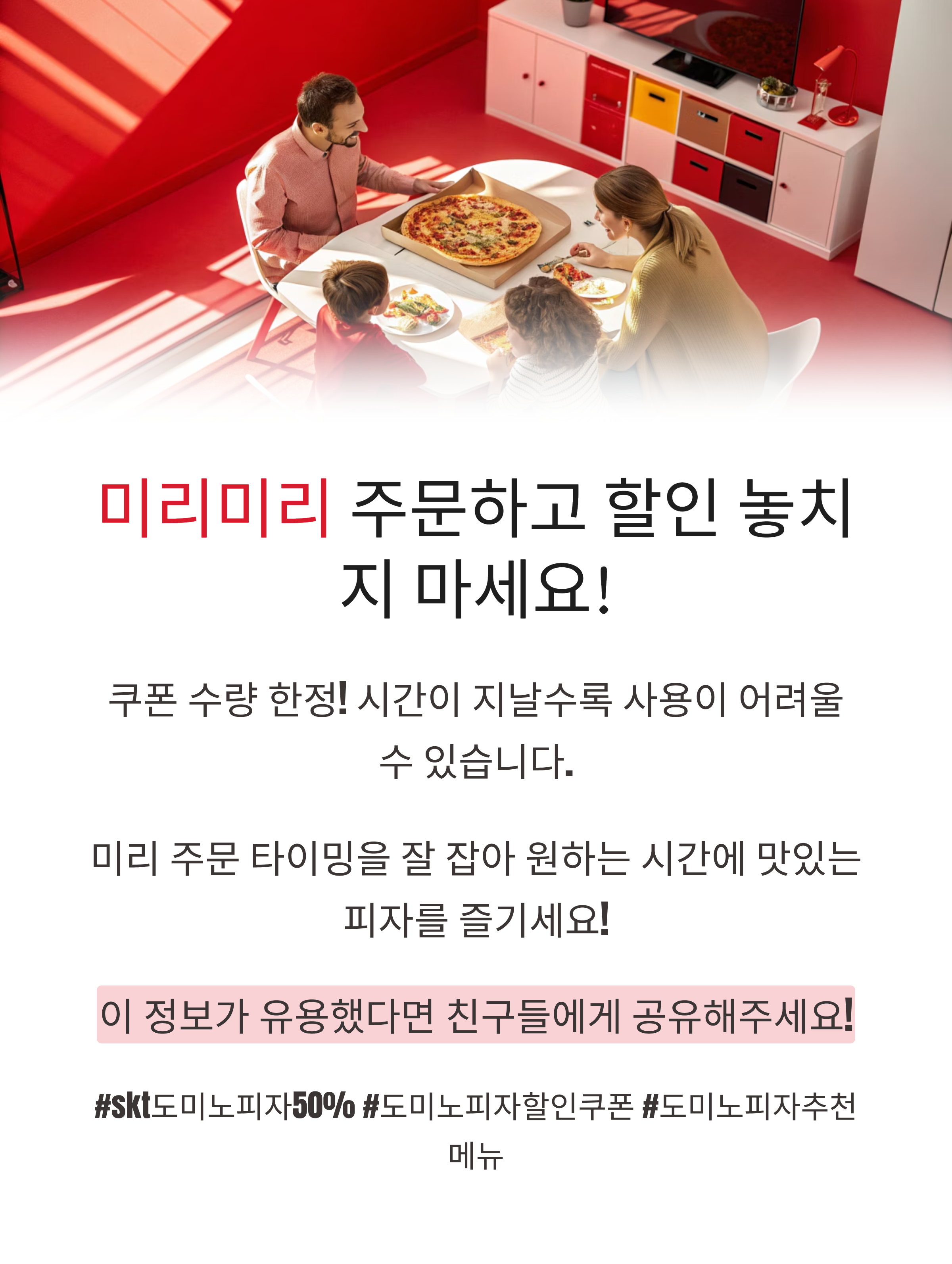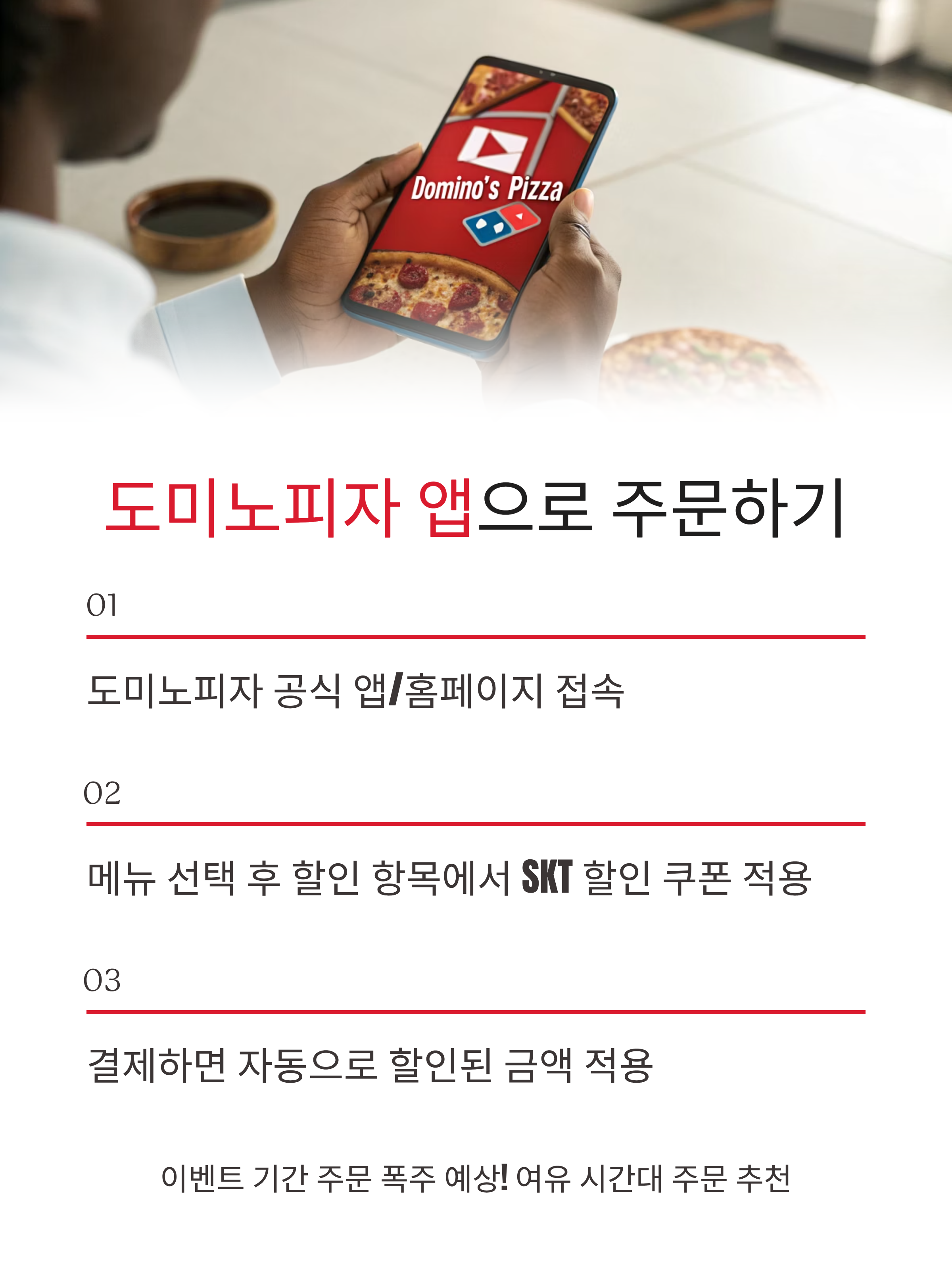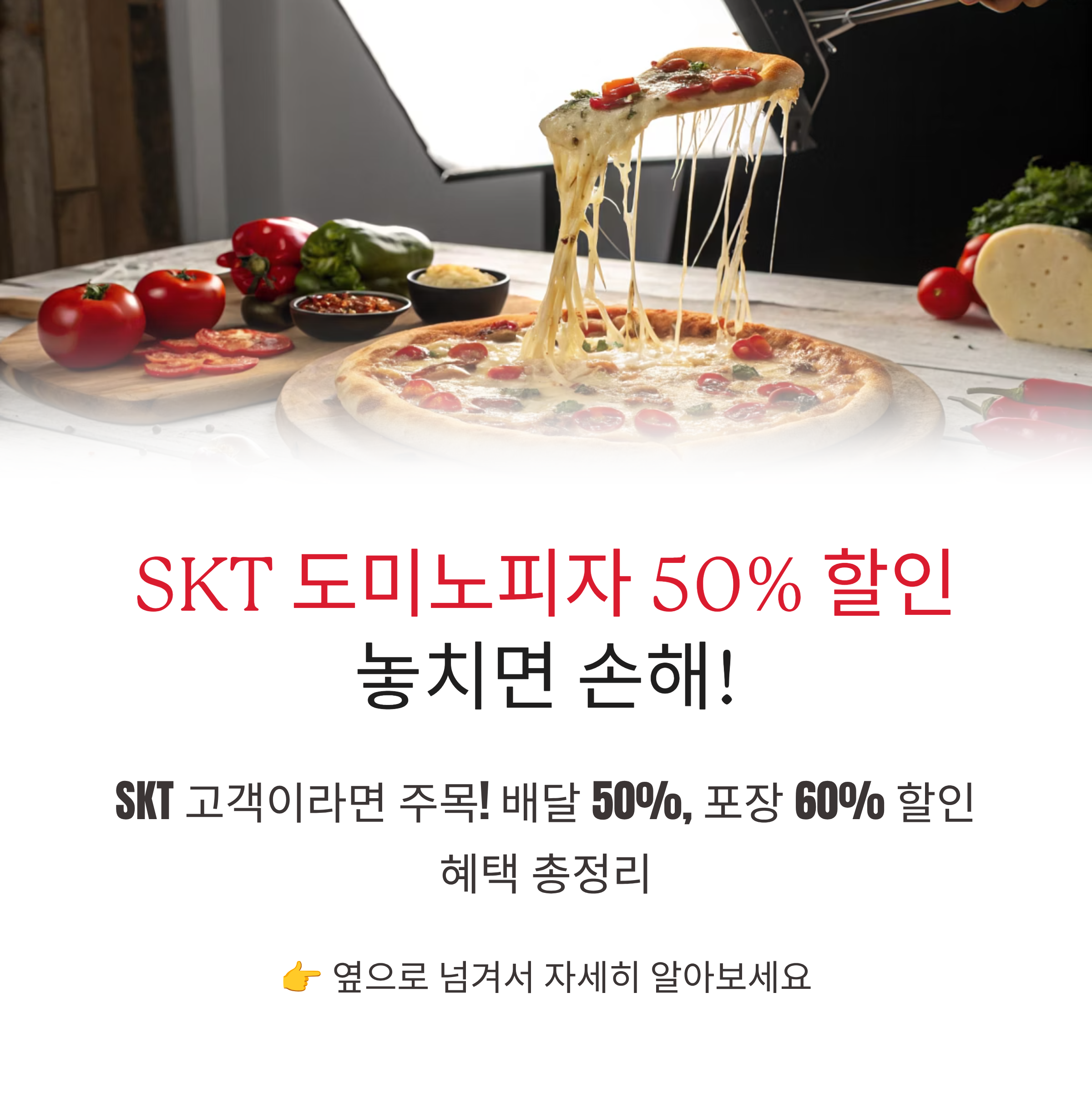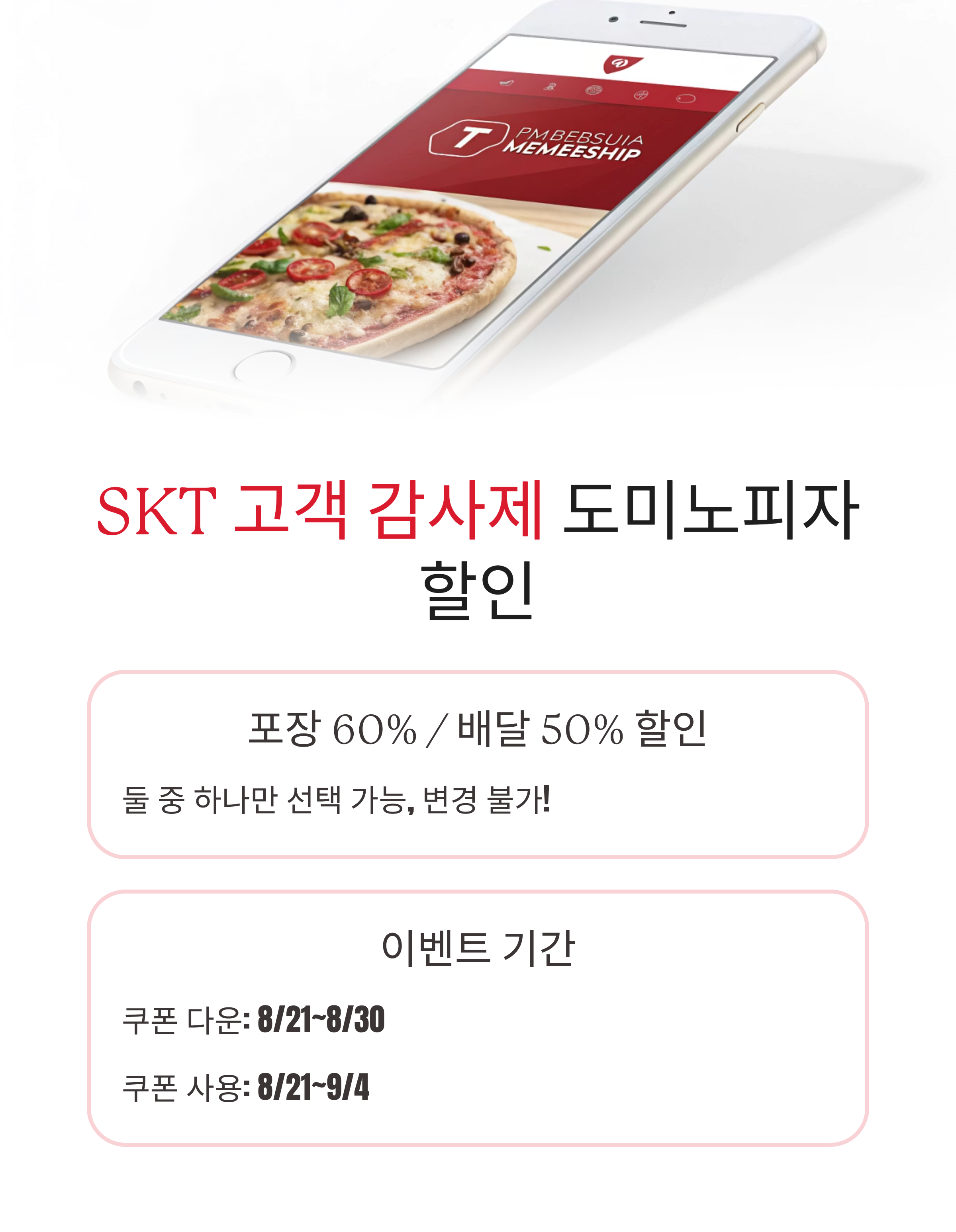🍕 SKT 고객이라면 절대 놓치면 안 될 소식! 8월 21일부터 시작된 도미노피자 50% 할인 이벤트는 포장은 60%, 배달은 50%까지 혜택을 받을 수 있어 인기 메뉴를 반값에 즐길 수 있는 기회입니다. 단, 쿠폰은 포장/배달 중 1종만 선택 가능하고 변경이 불가하니 신중하게 선택하세요!