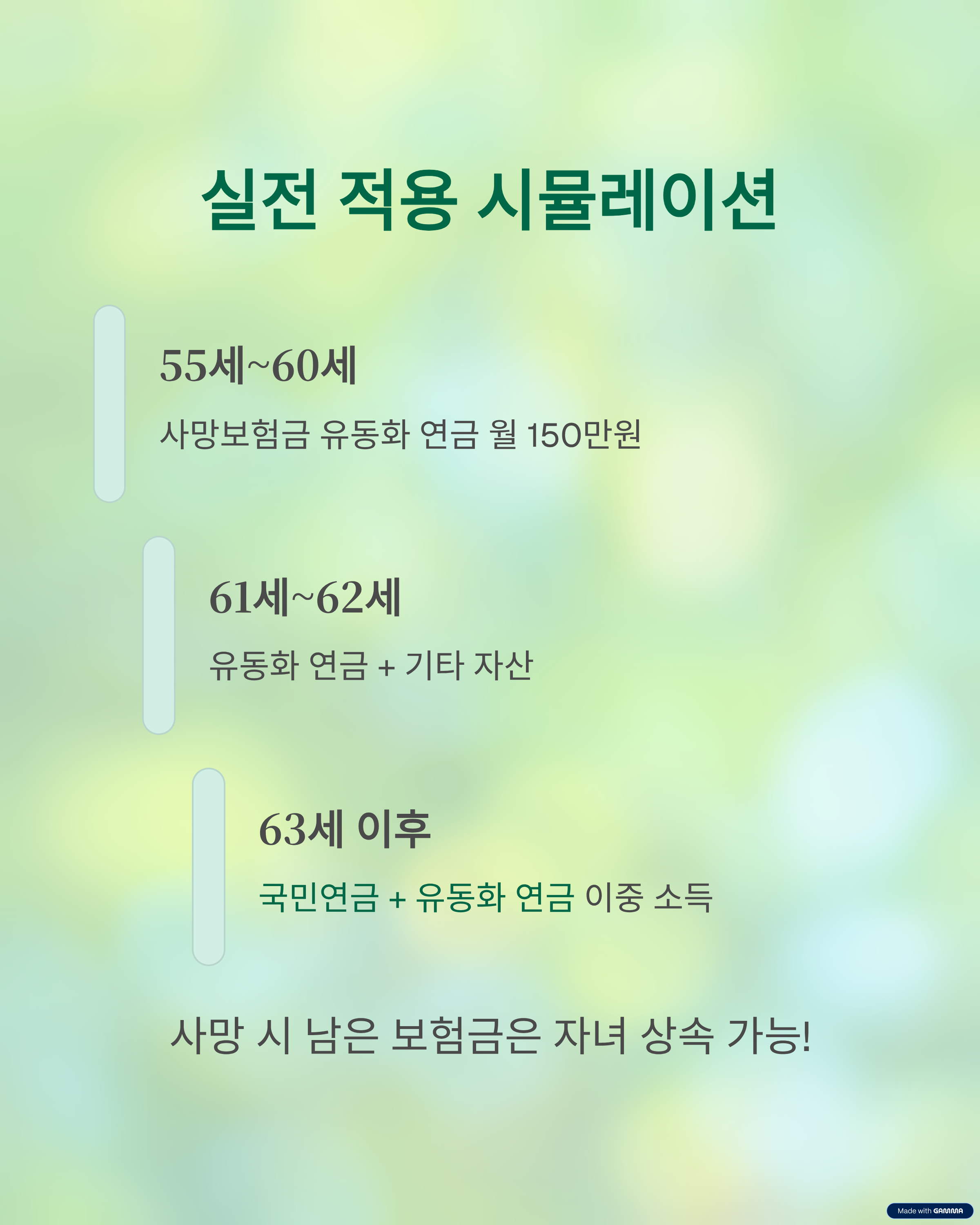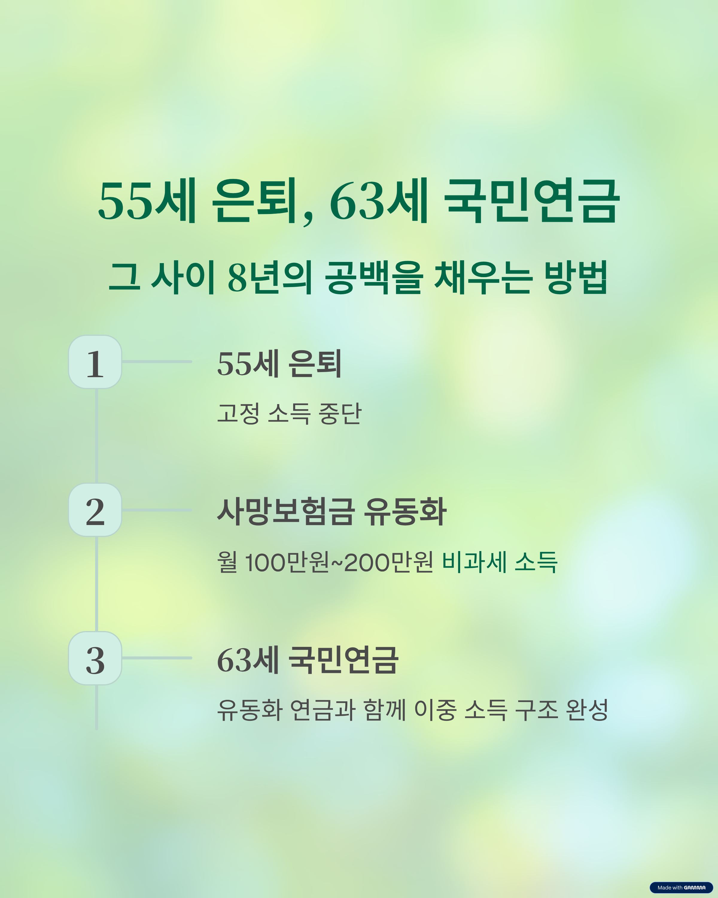 이 글에서는 은퇴 이후 국민연금 수령 전까지 발생하는 소득 공백기를 사망보험금 연금 유동화를 통해 세금 없이 매달 안정적인 수입을 확보하는 방법을 다룹니다.
