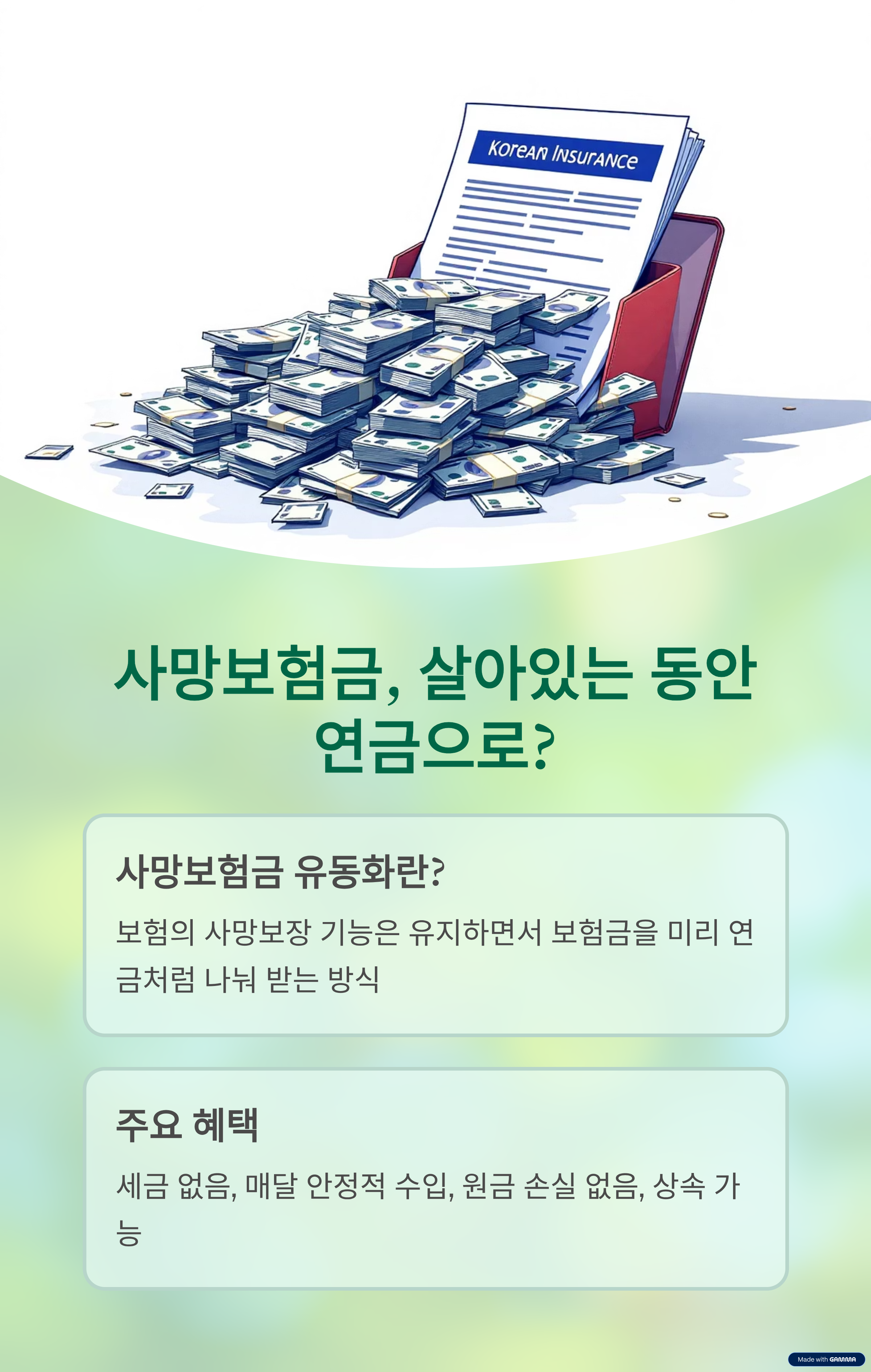사망보험금 연금 유동화는 한 번의 설계로 세금 없이 평생 현금 흐름을 확보하는 전략입니다.