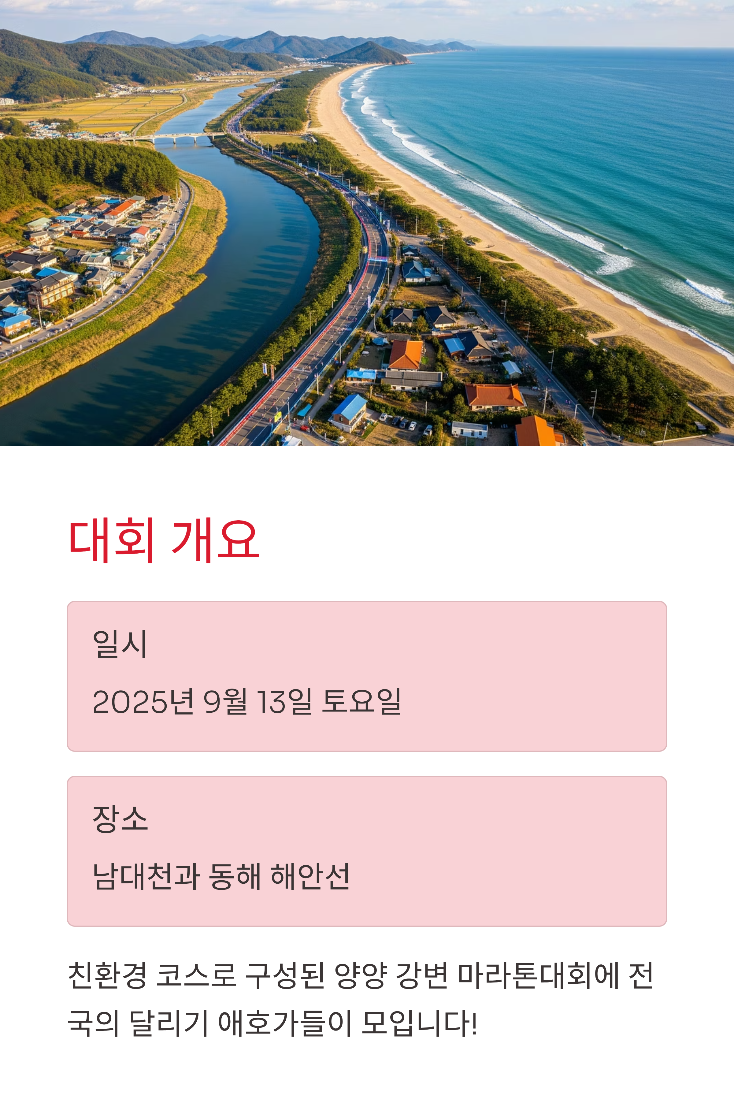 2025년 9월 13일 토요일, 강원특별자치도 양양군 남대천과 동해 해안선을 따라 펼쳐지는 양양 강변 마라톤대회가 열립니다. 이번 대회는 남대천을 중심으로 낙산, 동호 해변, 웰컴센터 등을 잇는 친환경 코스로 구성되어 있으며 전국에서 달리기를 사랑하는 참가자들이 모일 예정입니다. 일정, 위치, 코스, 접수 정보, 참가비 등 꼭 알아야 할 내용을 정리했습니다.