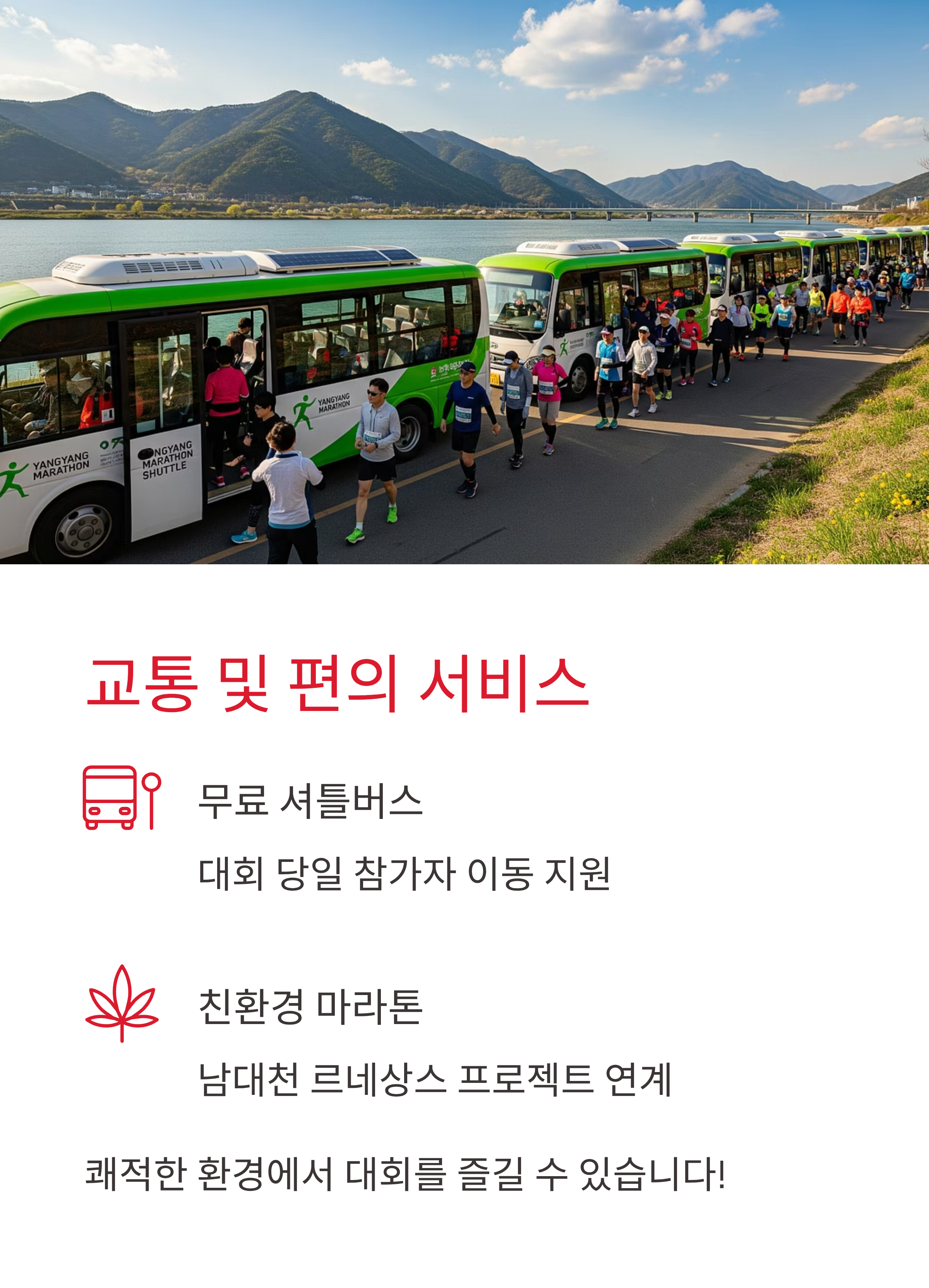대회 당일 무료 셔틀버스가 운영되어 참가자들의 이동을 돕습니다. 남대천 르네상스 프로젝트와 연계된 친환경 마라톤답게 쾌적한 환경에서 대회를 즐길 수 있습니다.