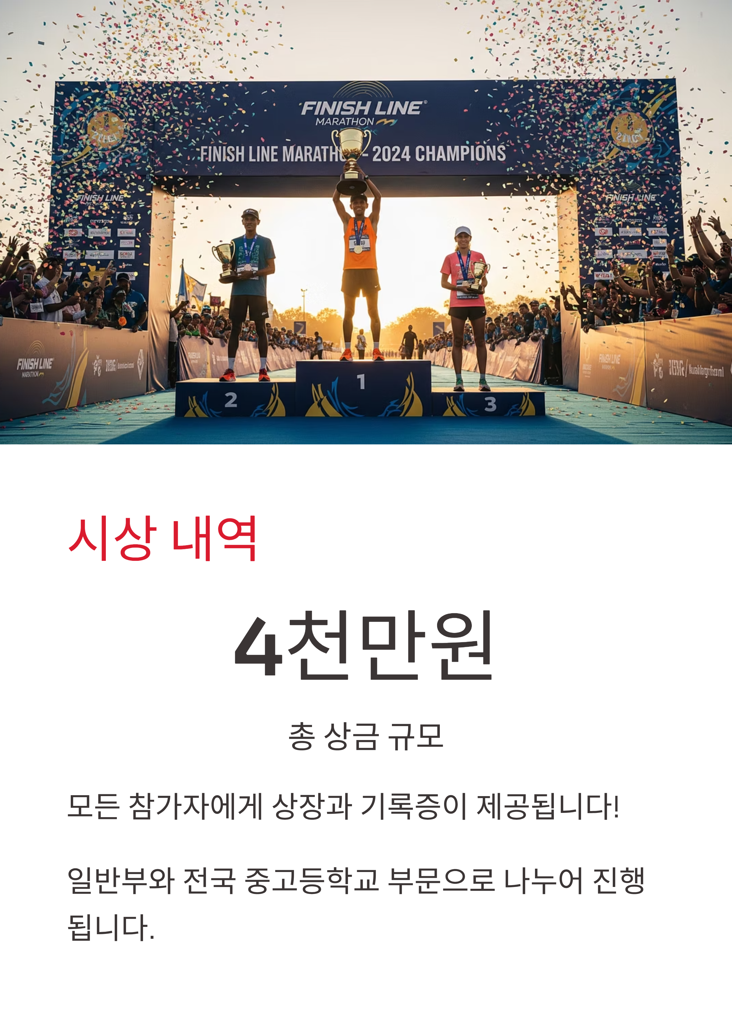 총 4천만 원 상당의 상금과 부상이 준비되어 있으며, 상장과 기록증도 제공됩니다. 일반부 외에도 전국 중고등학교 부문이 함께 열려 다양한 연령대가 참여할 수 있습니다.