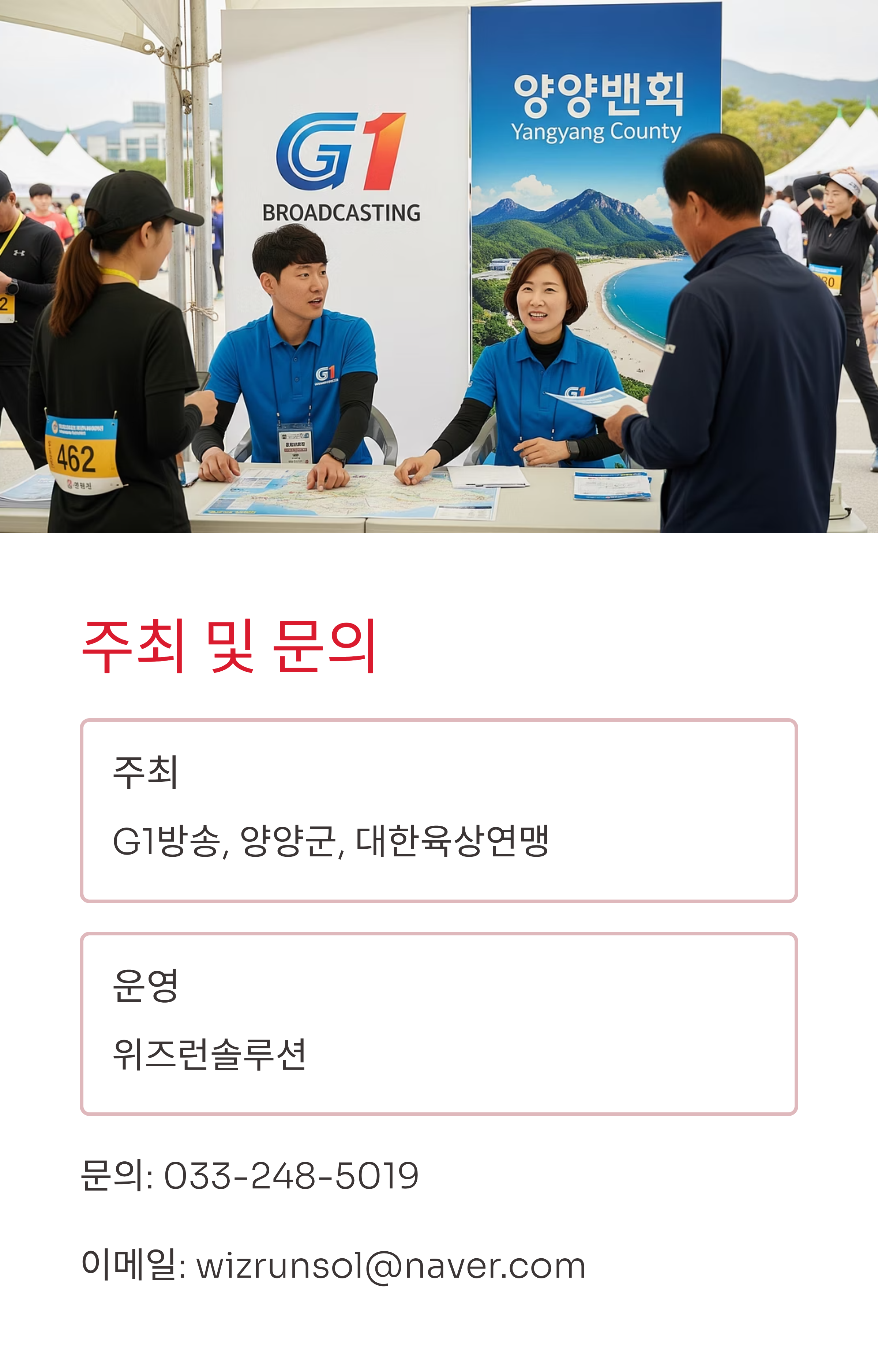 이번 대회는 G1방송, 양양군, 대한육상연맹이 공동 주최하며, 운영은 위즈런솔루션이 맡습니다. 문의는 전화(033-248-5019)나 이메일(wizrunsol@naver.com)로 가능합니다.