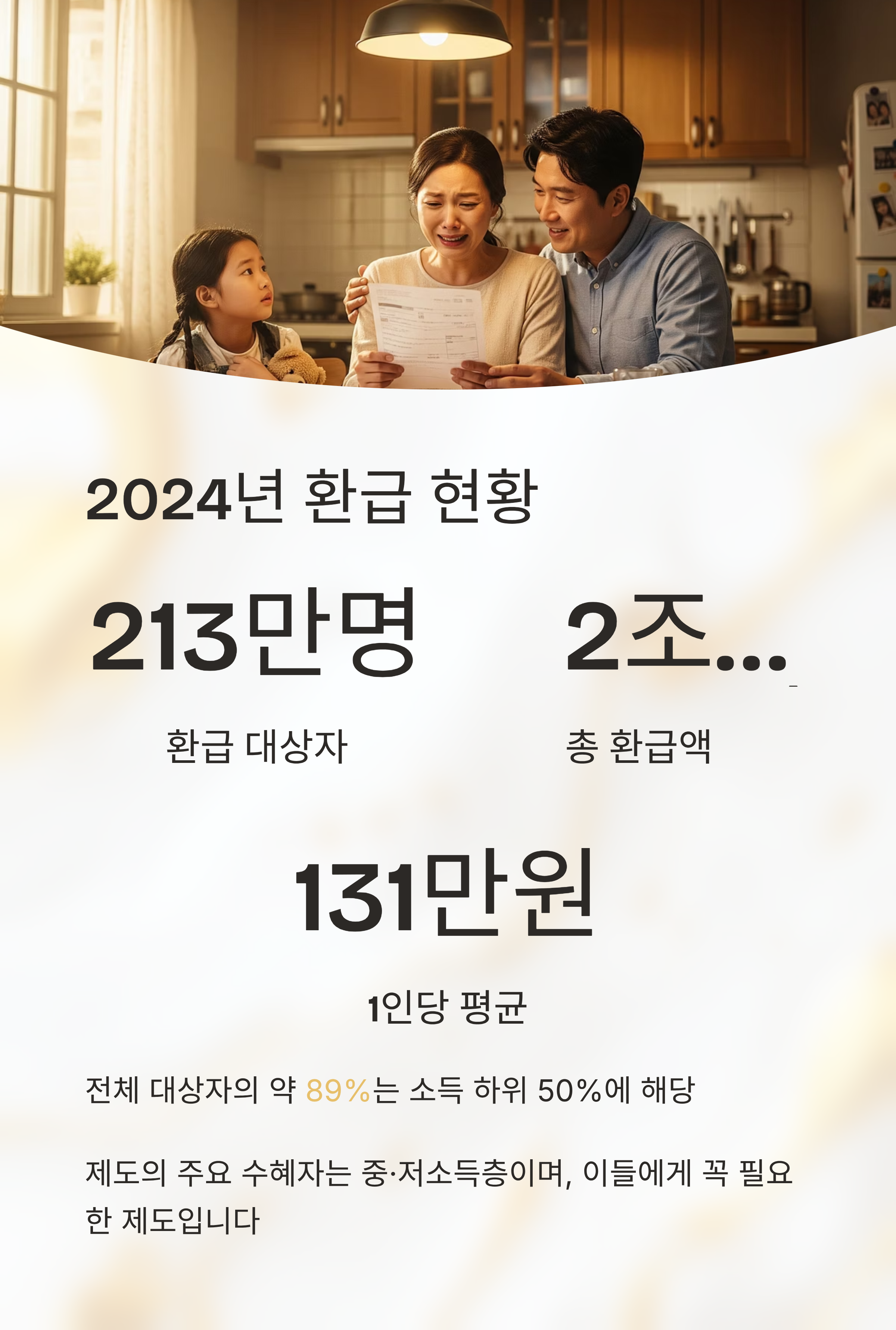 1인당 평균 환급액은 약 131만 원이고, 전체 대상자의 약 89%는 소득 하위 50%에 해당합니다.