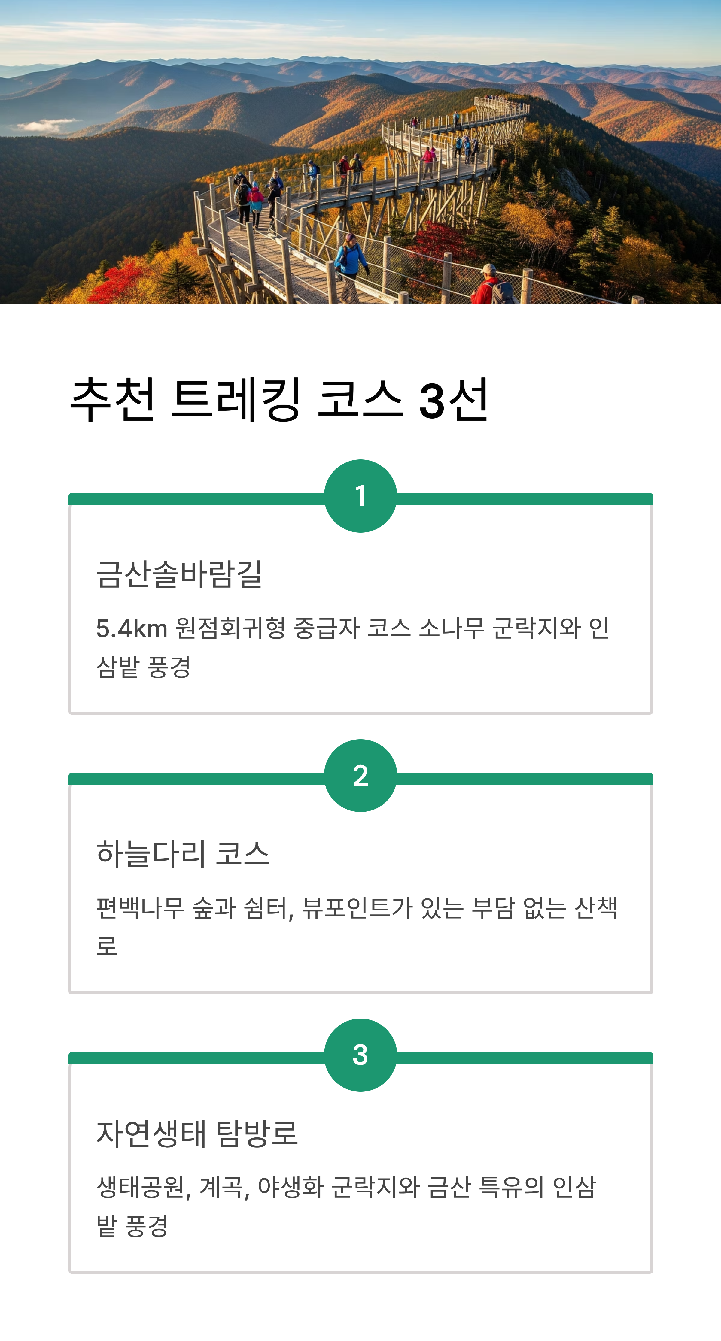 셋째, 자연생태 탐방로는 생태공원과 계곡, 야생화 군락지를 지나며, 금산 특유의 인삼 밭 풍경을 볼 수 있는 코스로 추천됩니다.