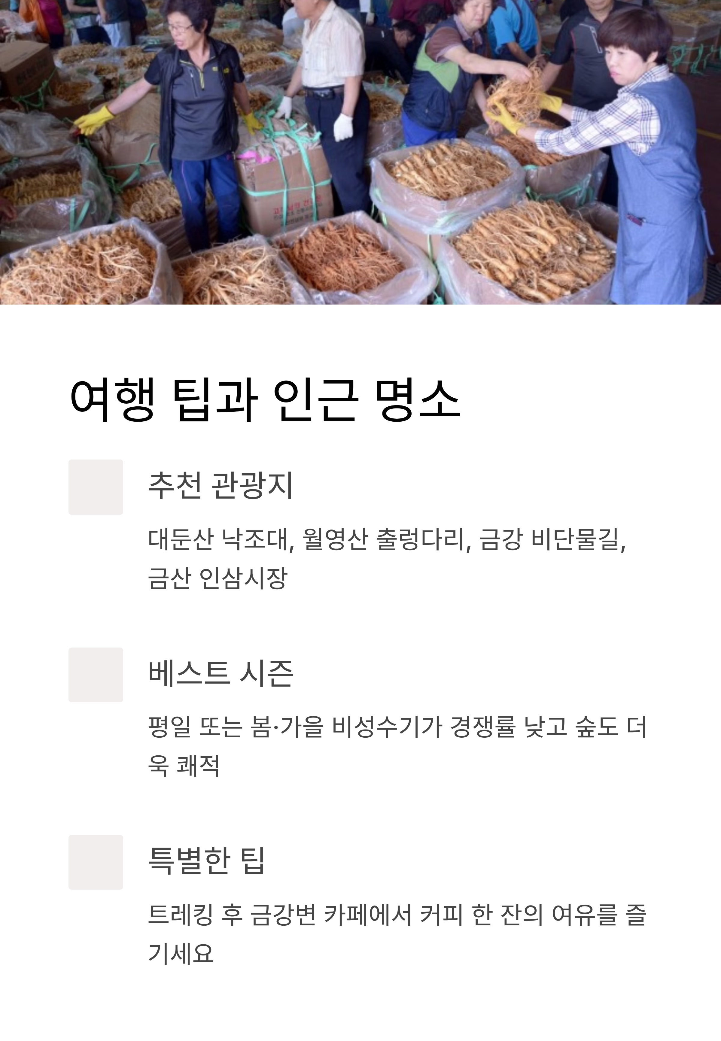 △대둔산 낙조대 △월영산 출렁다리 △금강 비단물길 △금산 인삼시장 등은 트레킹 후 들르기 좋은 관광지입니다.