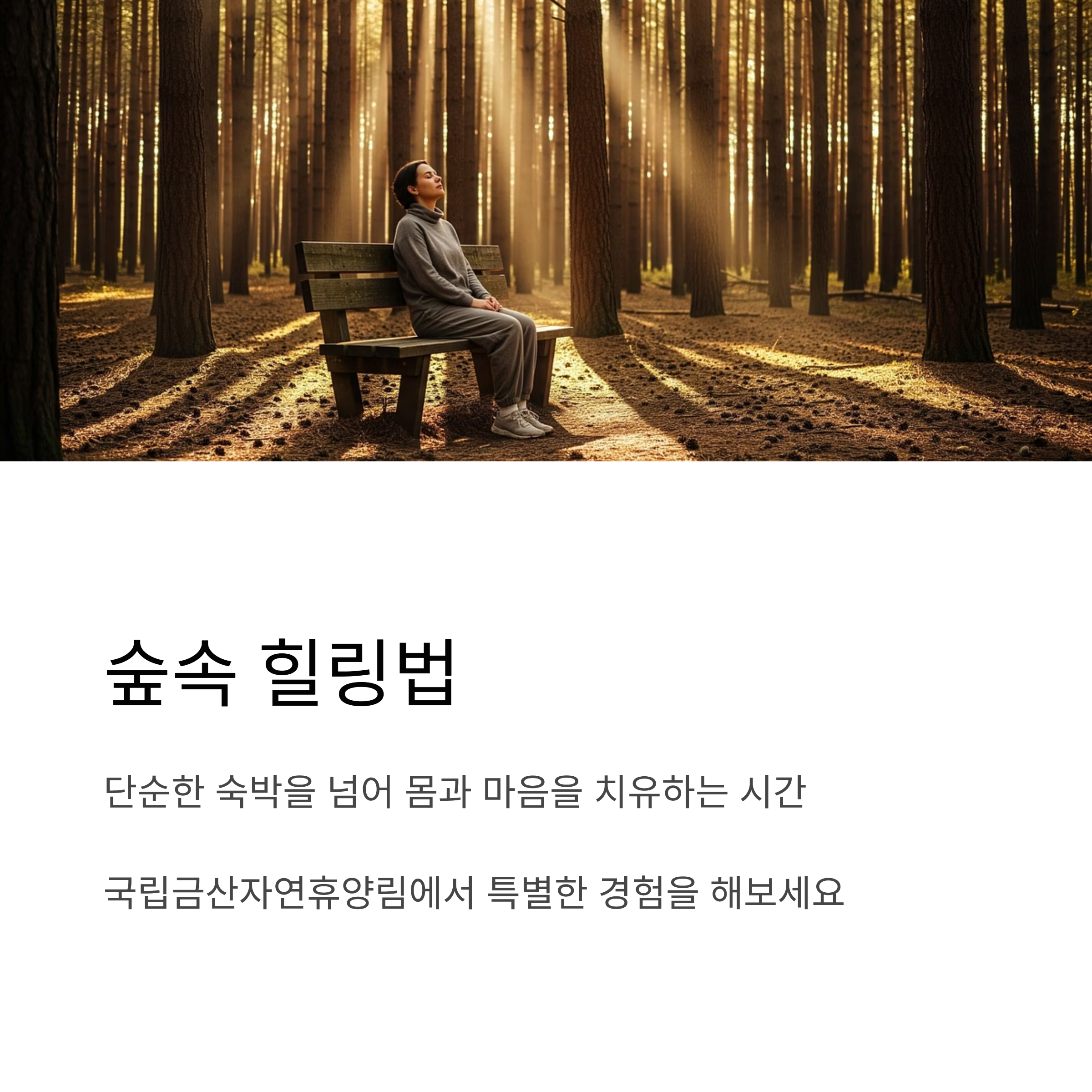 국산 목재 숙소 내부와 소나무·편백나무 숲을 걷다 보면 자연스럽게 깊은 숨과 함께 치유가 시작됩니다.