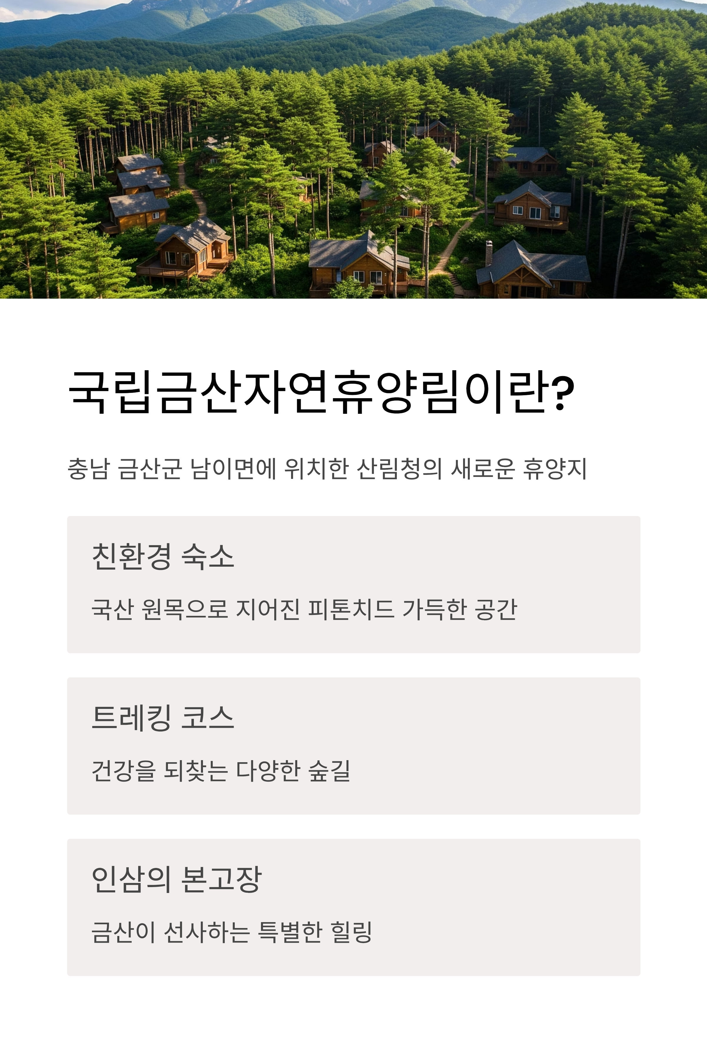 충남 금산군 남이면에 위치한 국립금산자연휴양림은 2025년 8월, 산림청이 새롭게 조성한 대표 휴양지입니다. 국산 원목을 활용한 친환경 숙소, 건강을 되찾는 숲속 트레킹 코스, 그리고 인삼의 본고장 금산이 선사하는 힐링이 이곳에 모두 모였습니다.