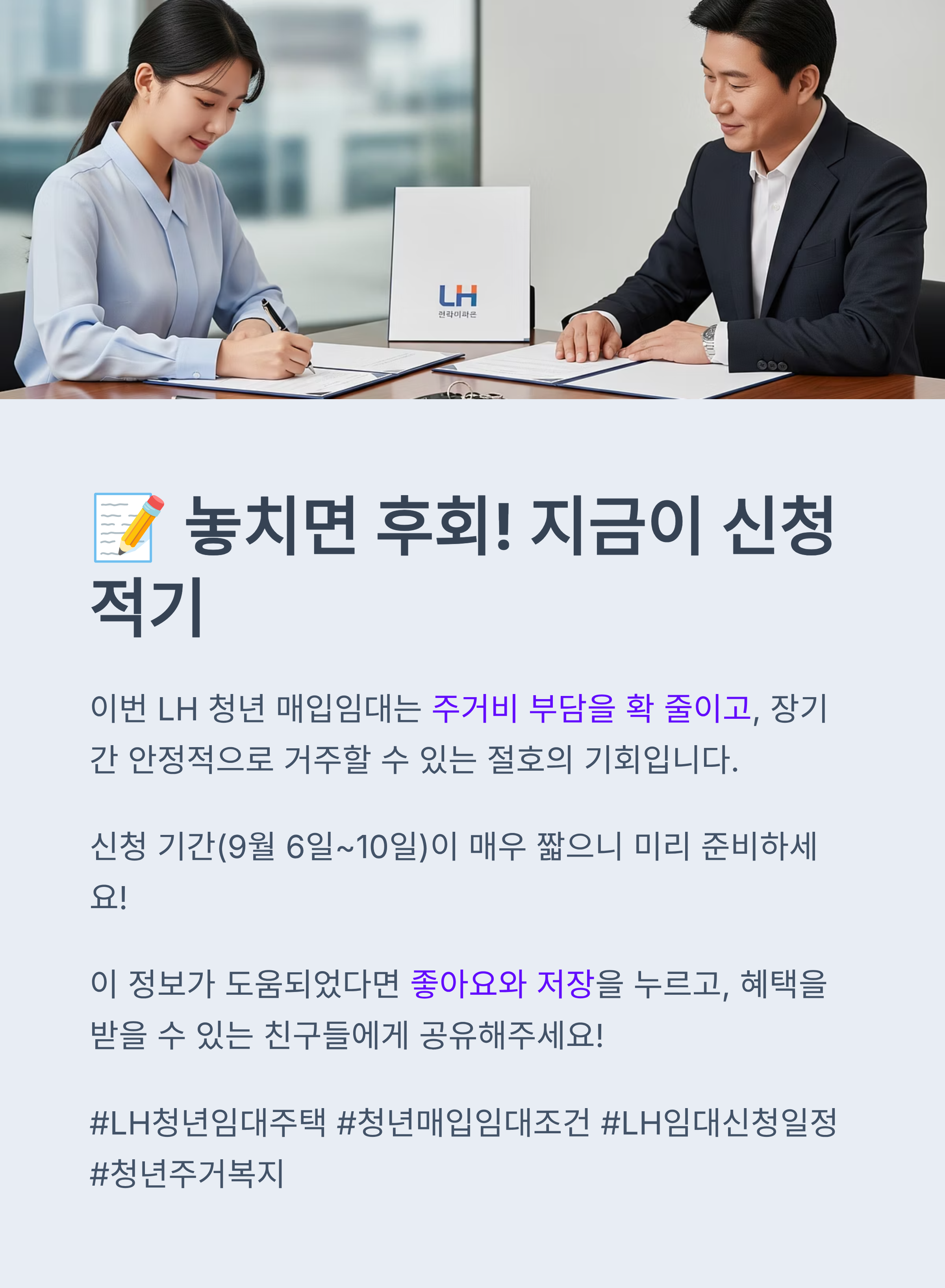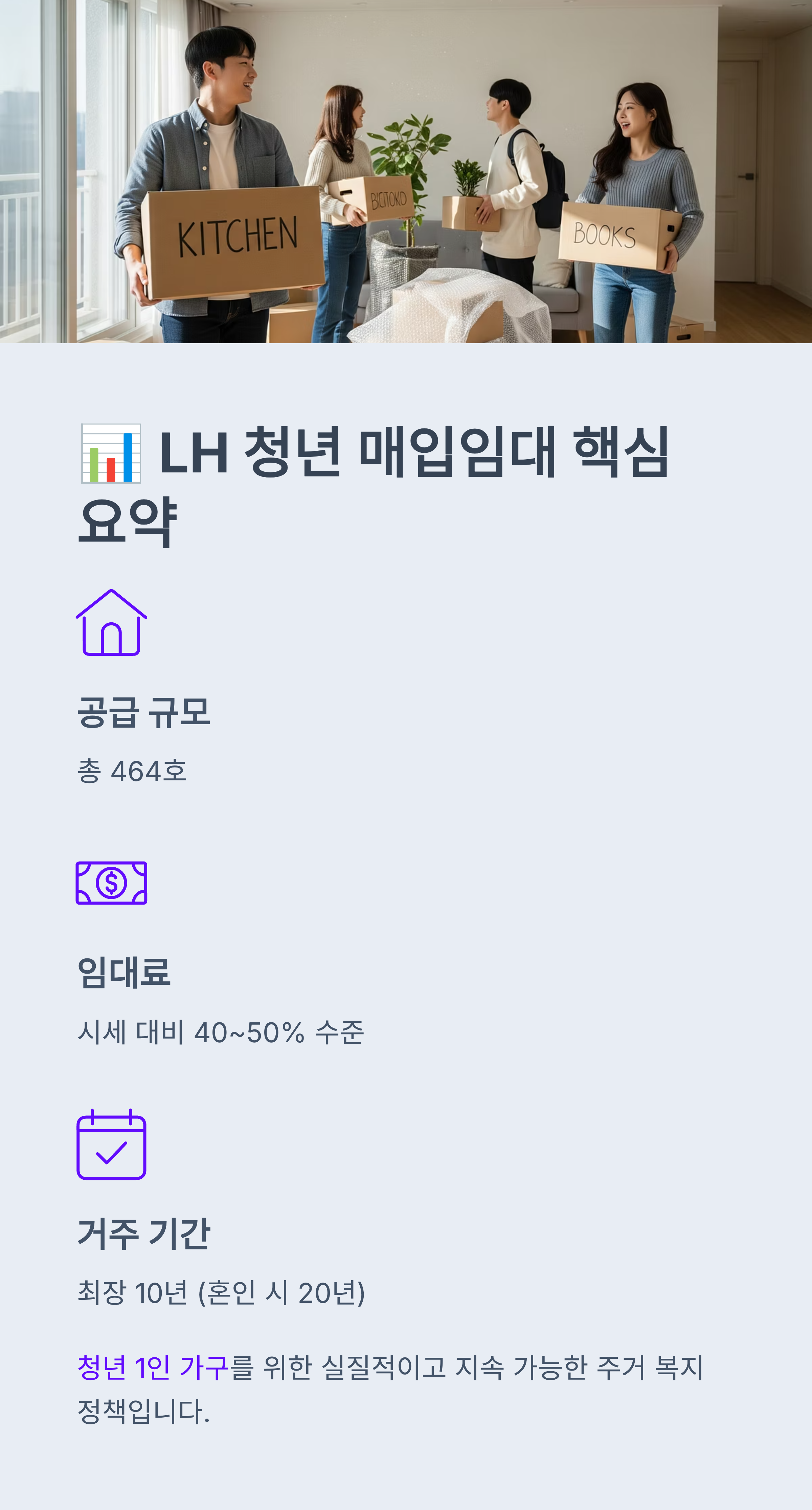 이번 LH 청년 매입임대 모집은 주거비 부담을 줄이고 장기 거주가 가능하도록 해 안정적인 청년 생활 기반을 마련할 수 있는 절호의 기회입니다.