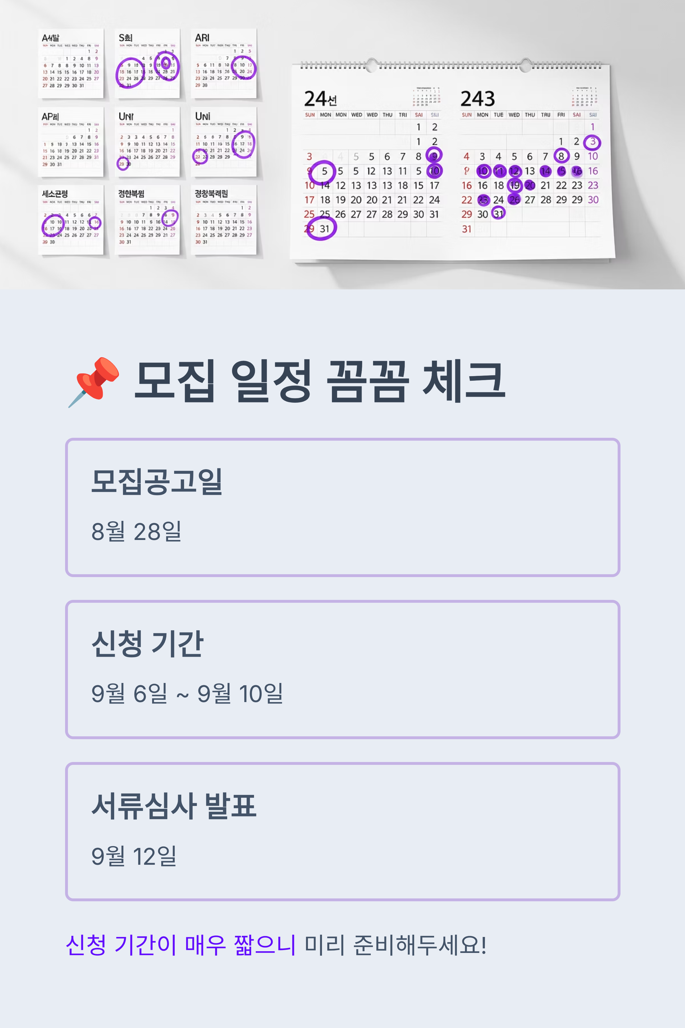 신청 일정은 짧고 집중되어 있으므로 미리 준비해두는 것이 중요합니다.