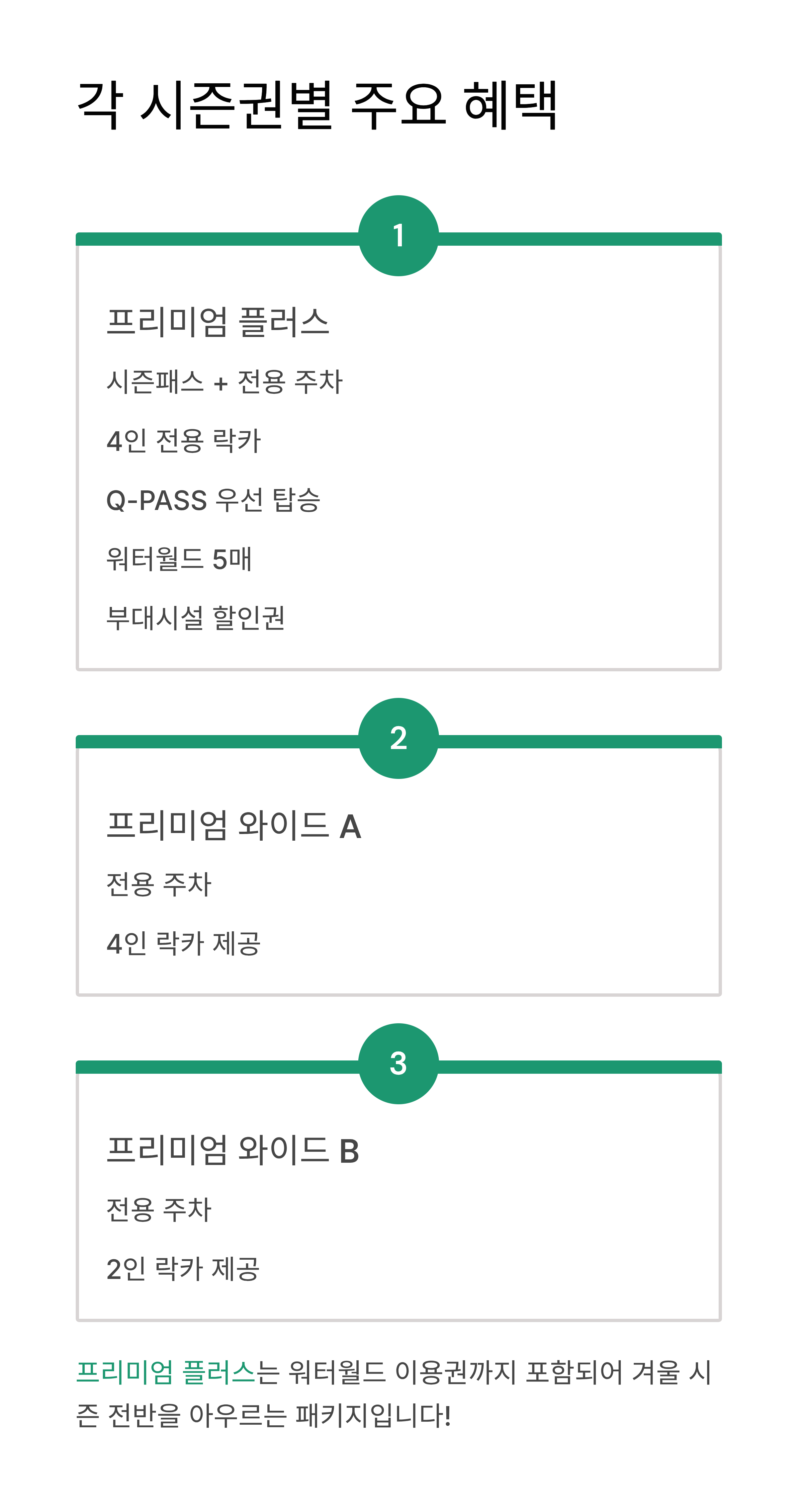 주차부터 락카, 우선탑승(Q-PASS), 워터월드 이용권 등 전 시즌을 아우르는 고급 서비스가 핵심입니다.