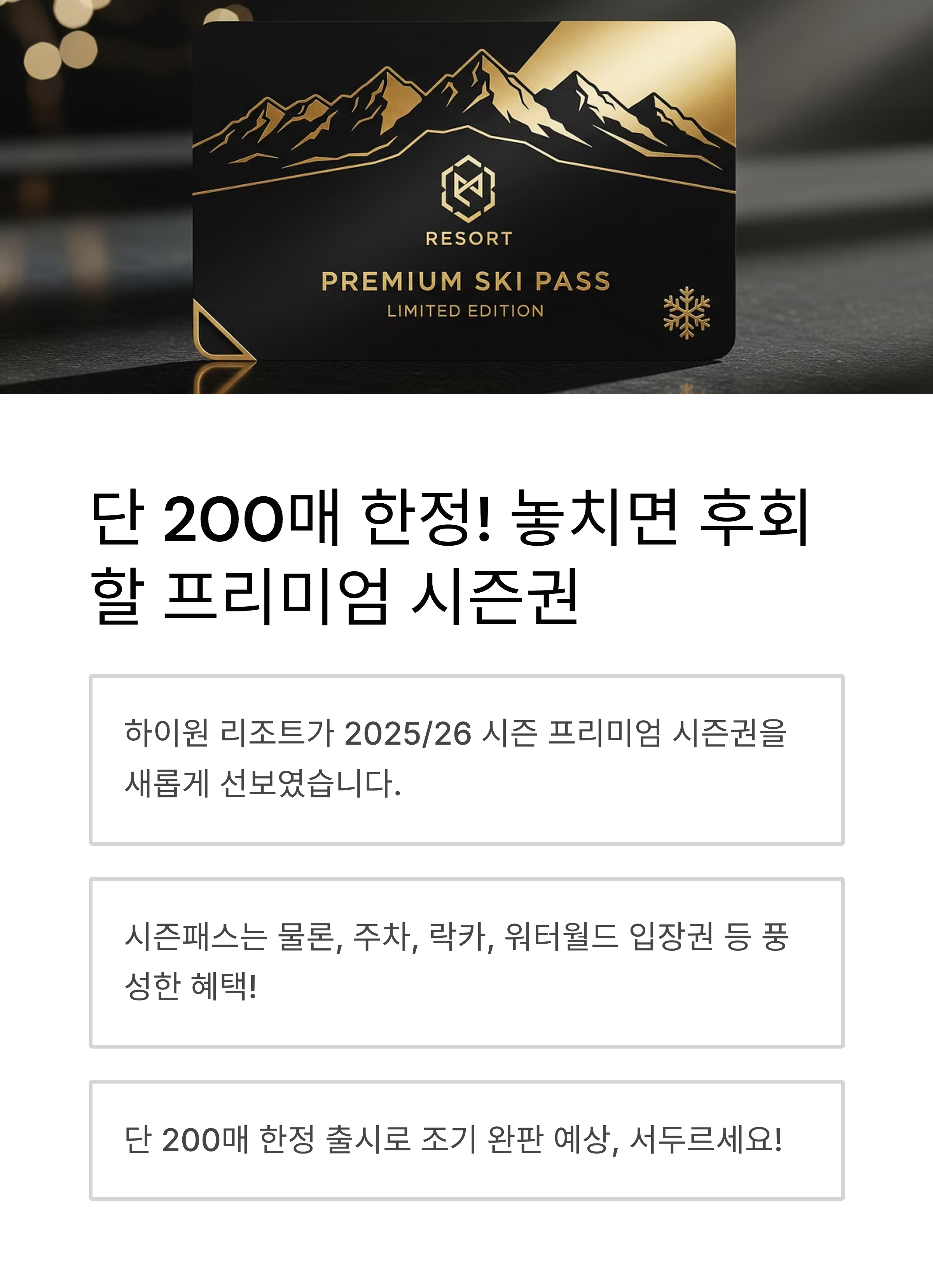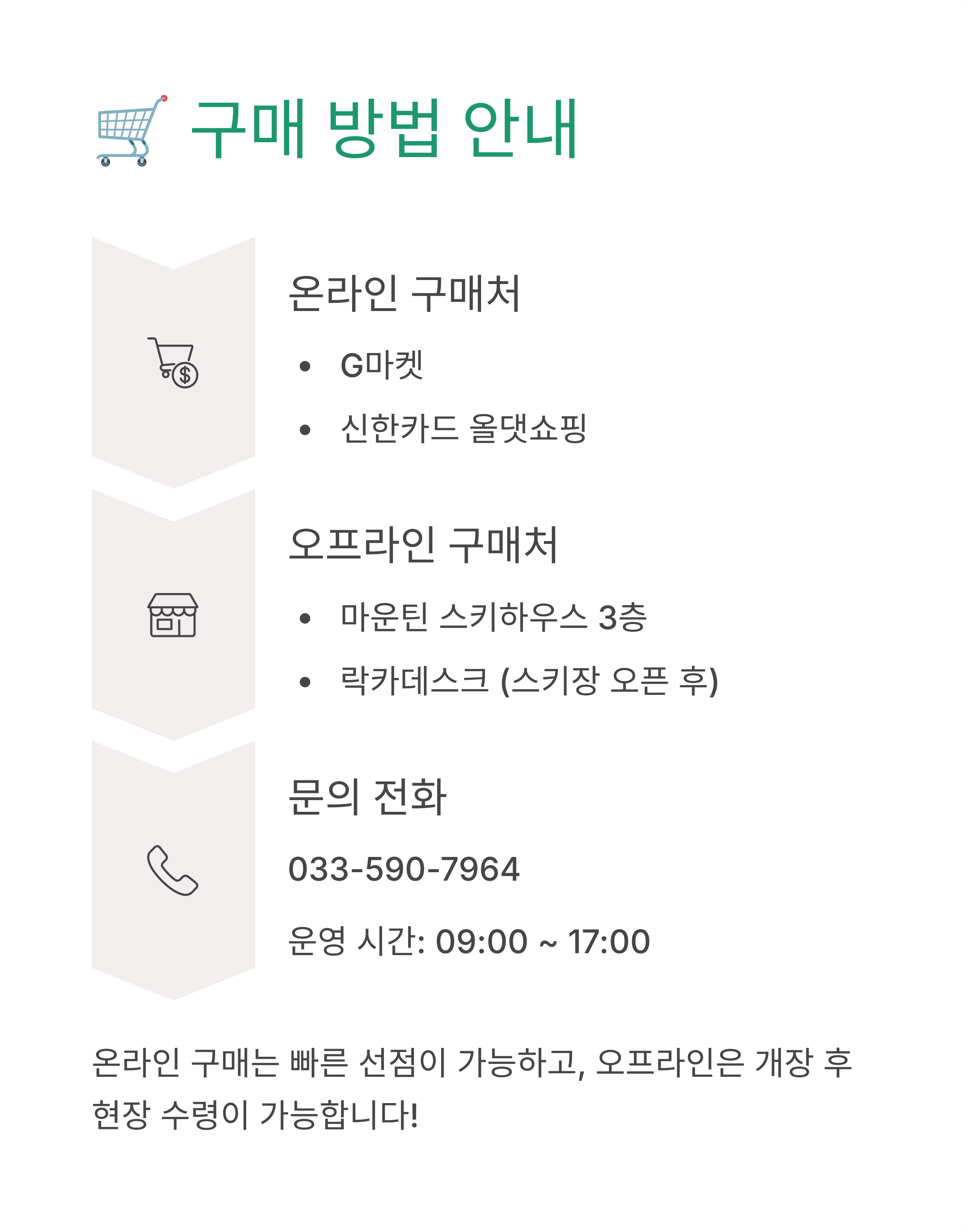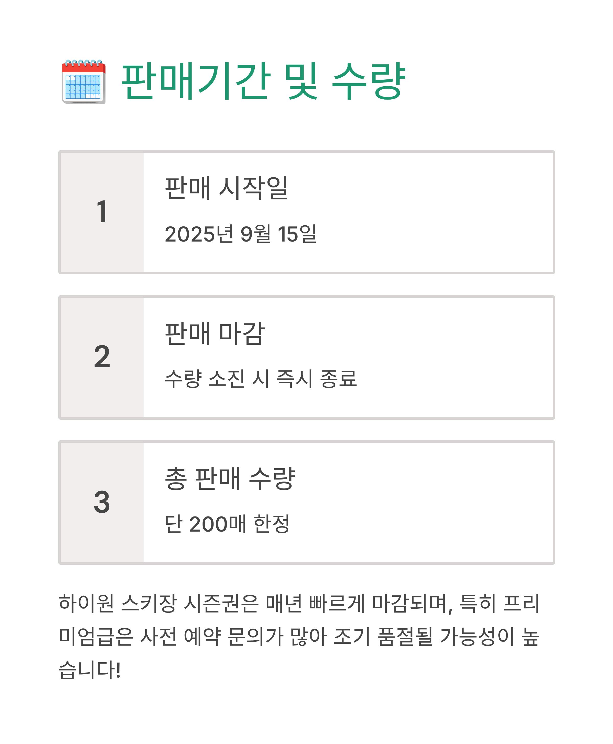 하이원 스키장 시즌권은 매년 빠르게 마감되며, 특히 프리미엄급 구성은 사전 예약 문의가 많아 조기 품절될 가능성이 높습니다.