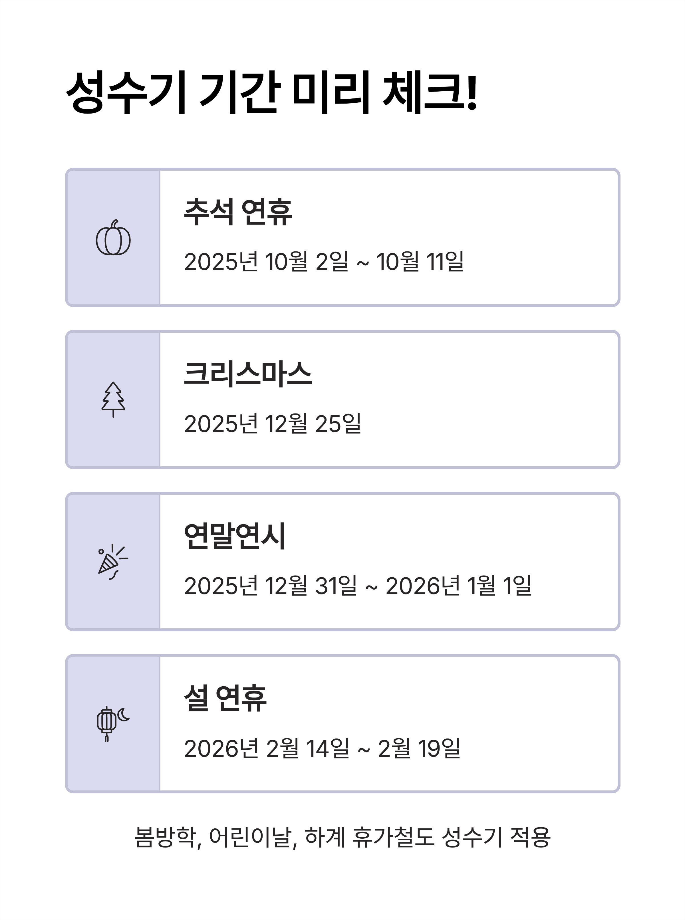 이 외에도 2026년 봄방학, 어린이날, 하계 휴가철 등이 성수기 구간으로 지정되어 있어 반드시 출발일 확인 후 예약하는 것이 중요합니다.