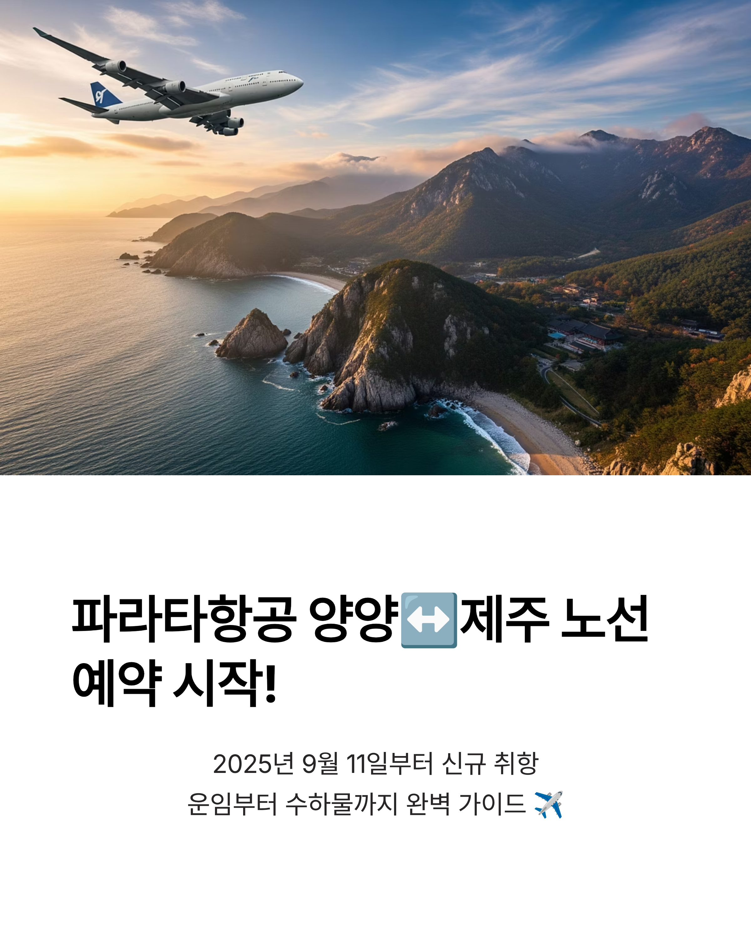2025년 9월 11일부터 파라타항공 양양-제주 노선 항공권 예약이 시작됩니다. 운임, 수하물, 성수기 요금까지 총정리! 빠르게 예약 원하시면 아래 버튼에서 확인하세요.