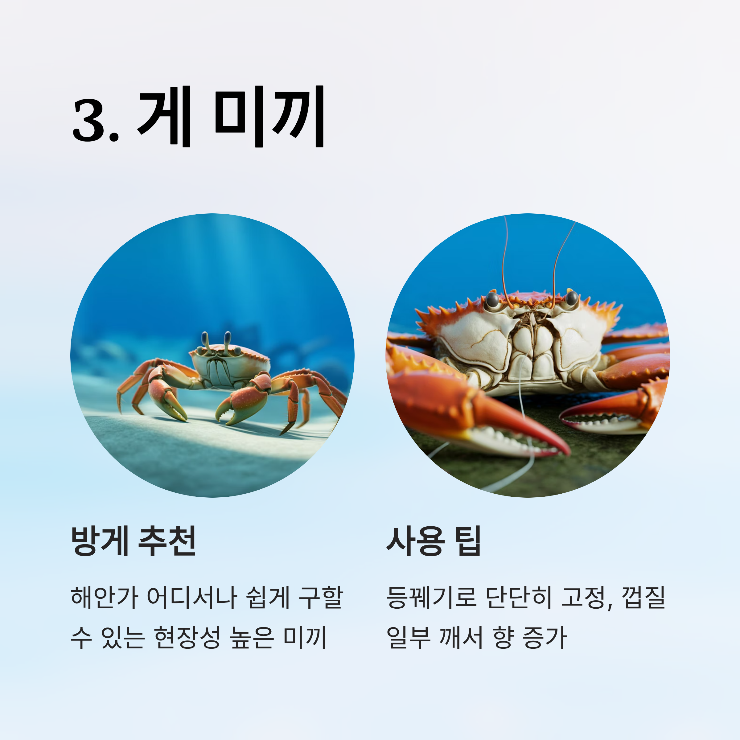 특히 방게는 해안가 어디서나 쉽게 구할 수 있어 현장성 높은 미끼로 꼽힌다.