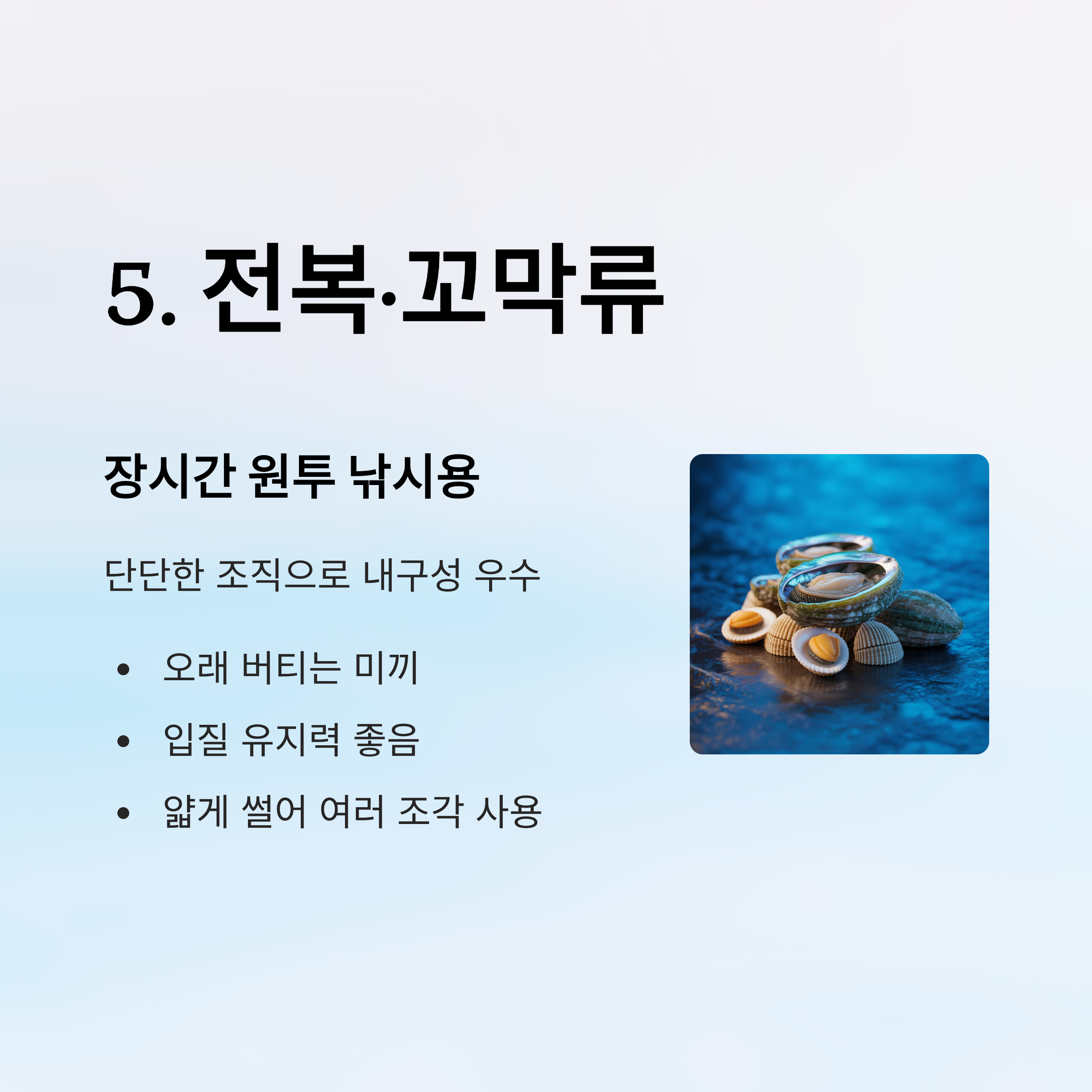 성게와 소라는 기본, 방게와 새우는 응용형, 전복이나 꼬막류는 장시간 대기용으로 활용하면 좋다.