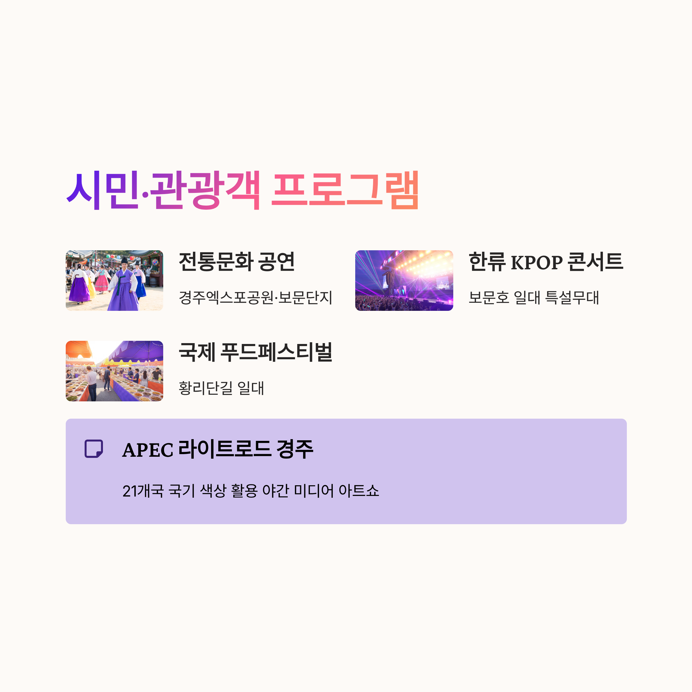 경주시는 APEC 기간 동안 시민 참여형 축제를 함께 운영합니다.