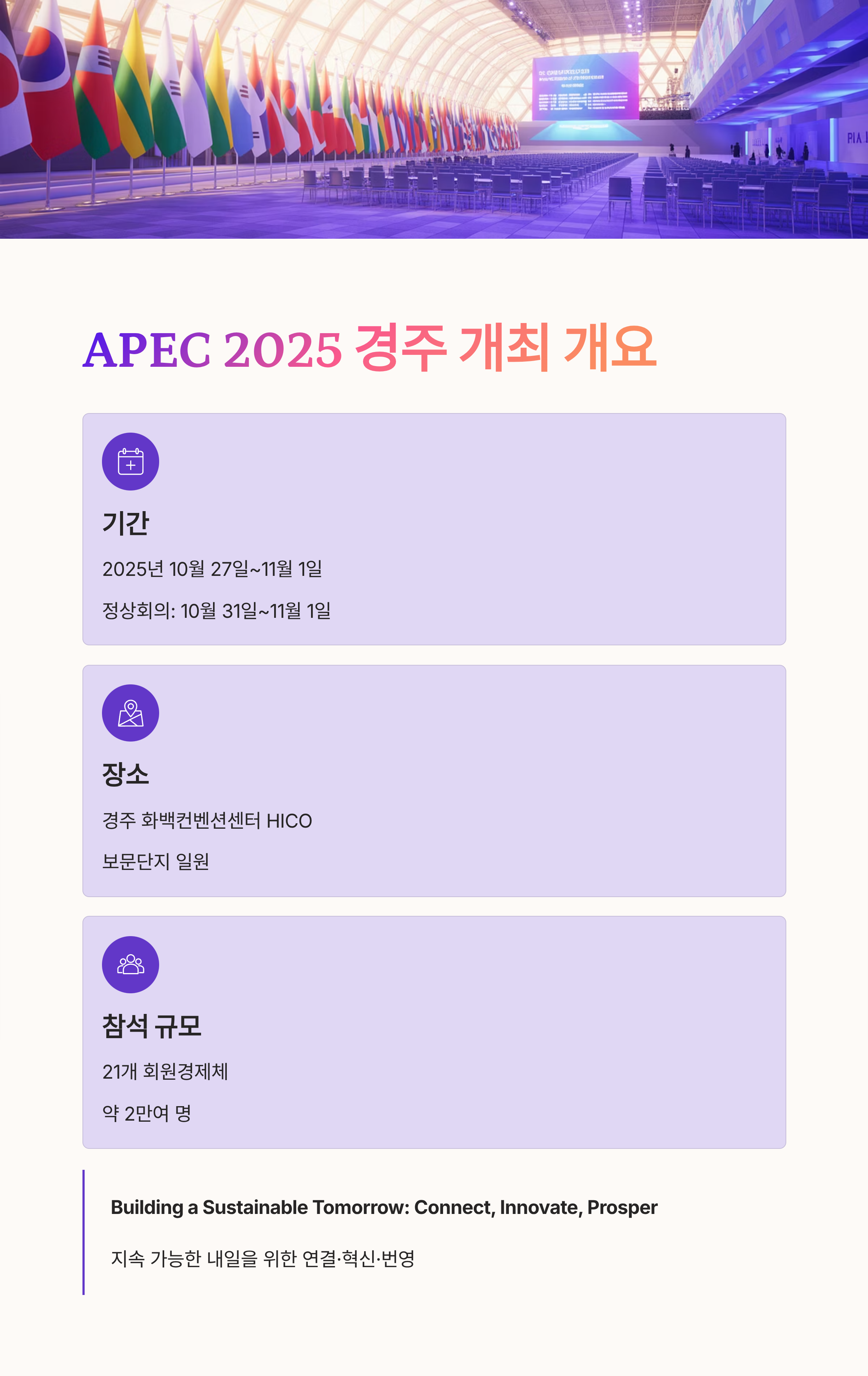 제33차 아시아태평양경제협력체 APEC 정상회의가 오는 2025년 10월 31일 금요일부터 11월 1일 토요일까지 경상북도 경주시 화백컨벤션센터 HICO에서 공식 개최됩니다.