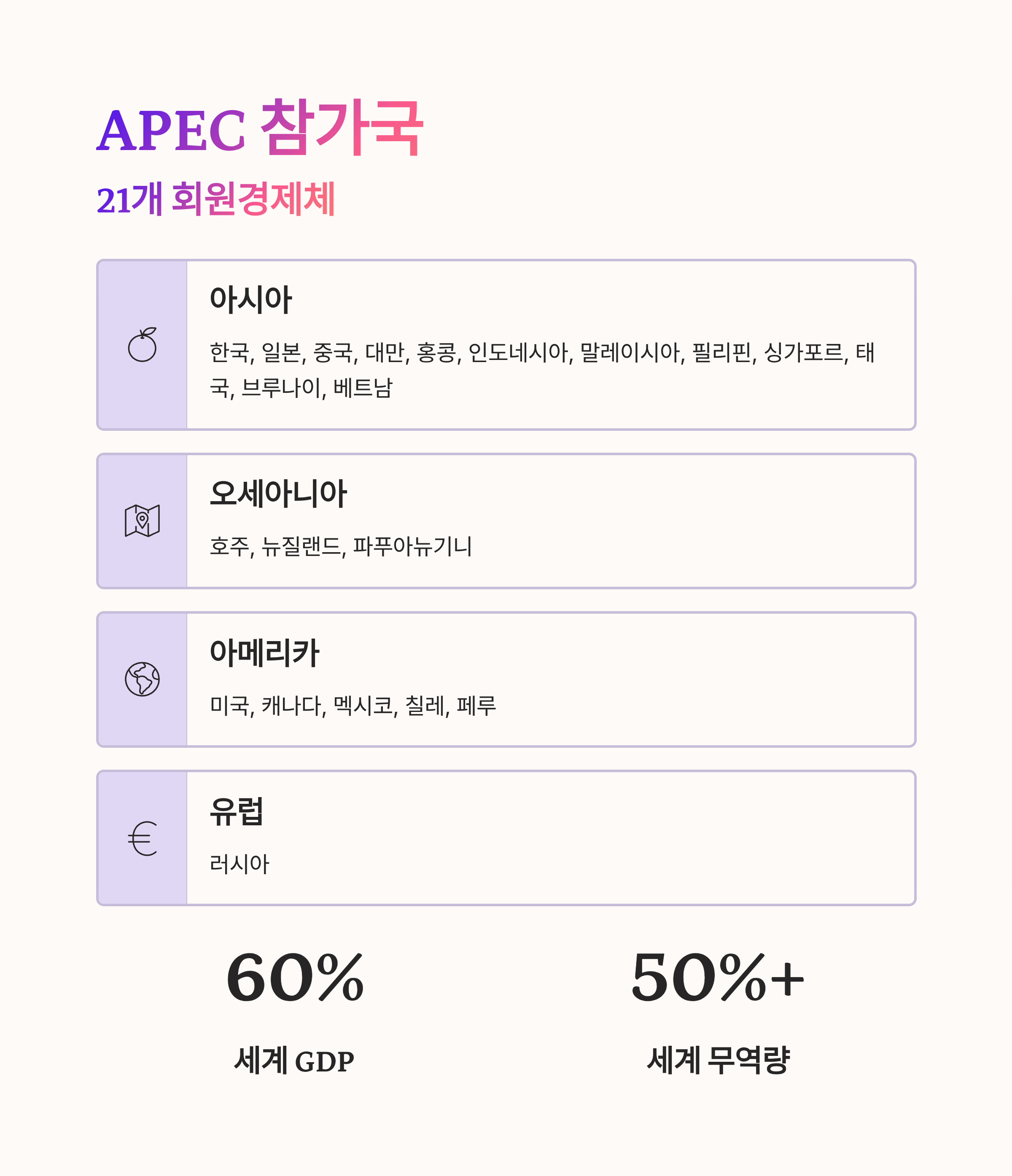 이들 21개 회원국은 아시아태평양 지역의 경제 정치 협력의 중심축을 이루고 있으며,