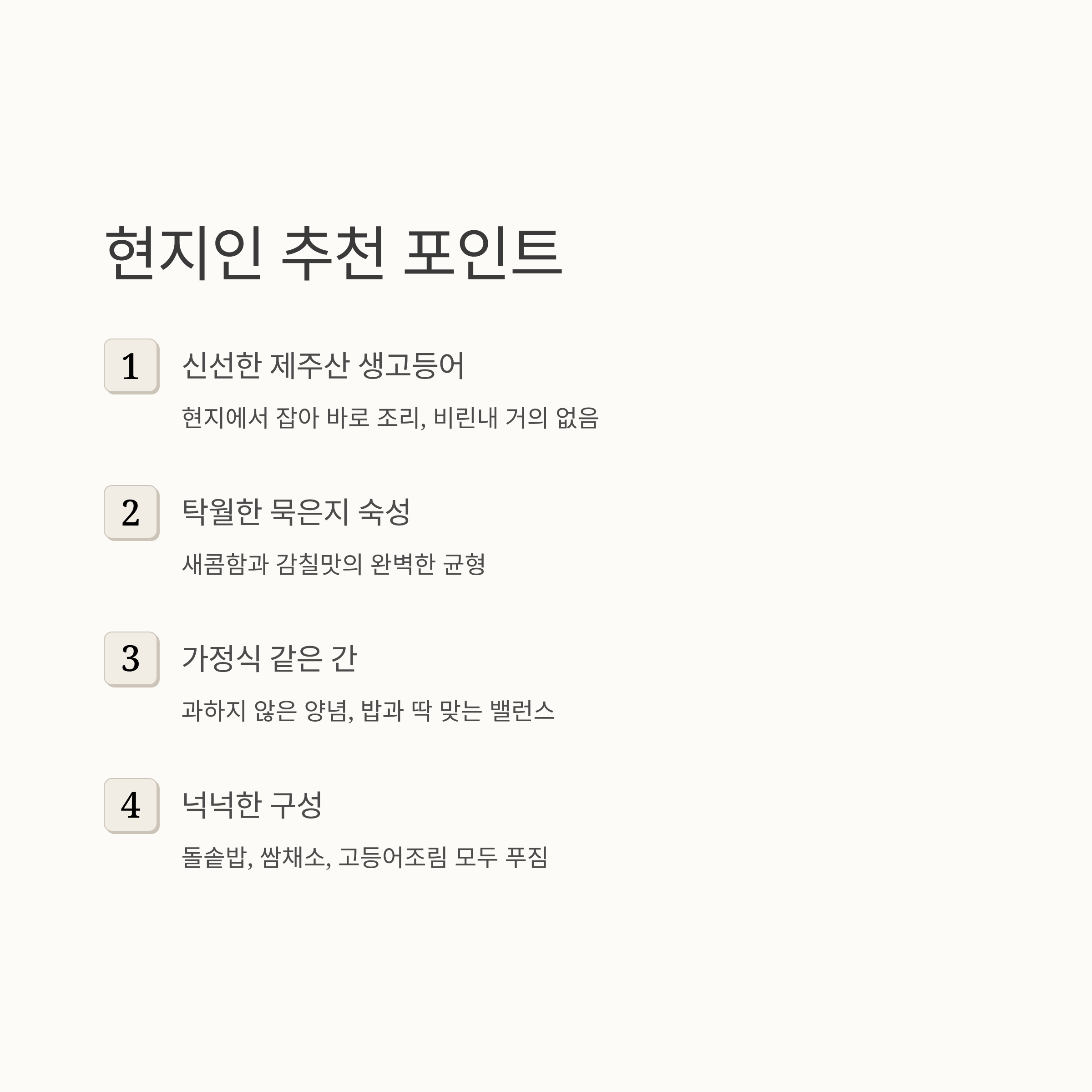 제주 현지인도 인정한 식당으로 알려져 있으며, 비린내 없는 고등어와 새콤한 묵은지의 조합이 입소문을 타며 꾸준히 인기다.
