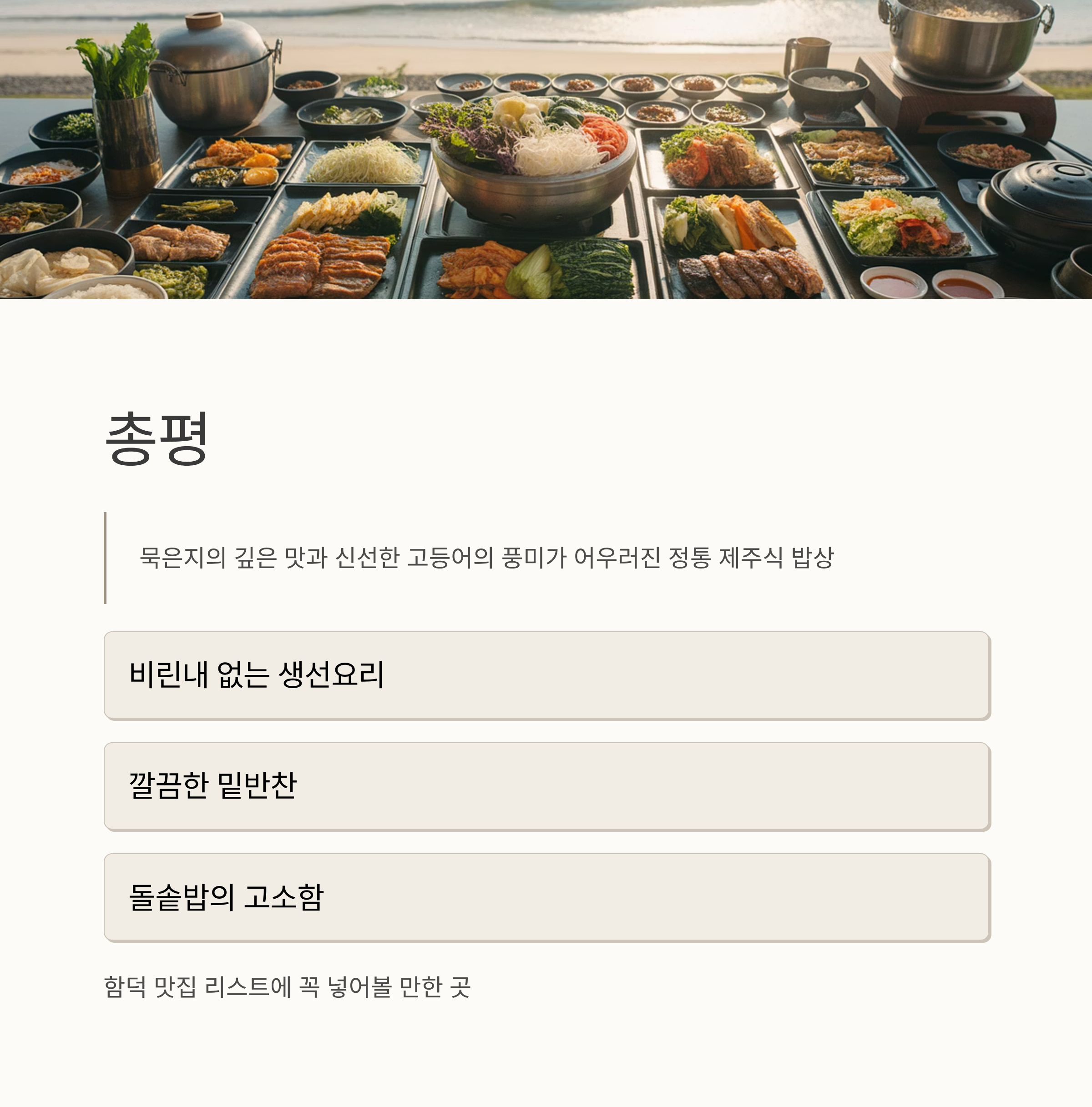 비린내 없는 생선요리, 깔끔한 밑반찬, 돌솥밥의 고소함까지 삼박자가 잘 어우러진 곳으로, 함덕 맛집 리스트에 꼭 넣어볼 만하다.
