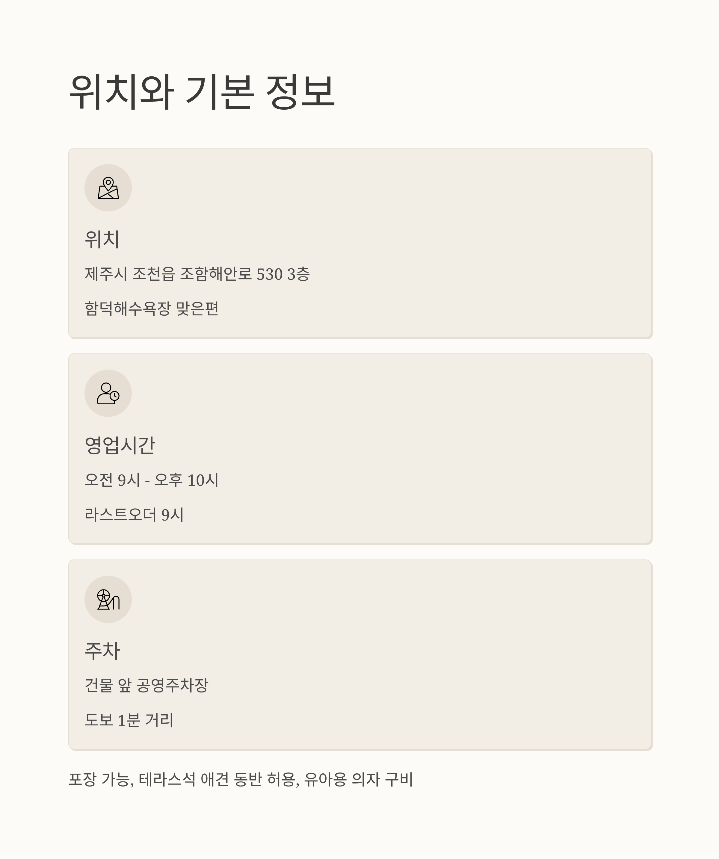 포장 주문이 가능하고, 테라스석은 애견 동반도 허용된다. 유아용 의자도 구비되어 있어 가족 단위 여행객에게도 적합하다.