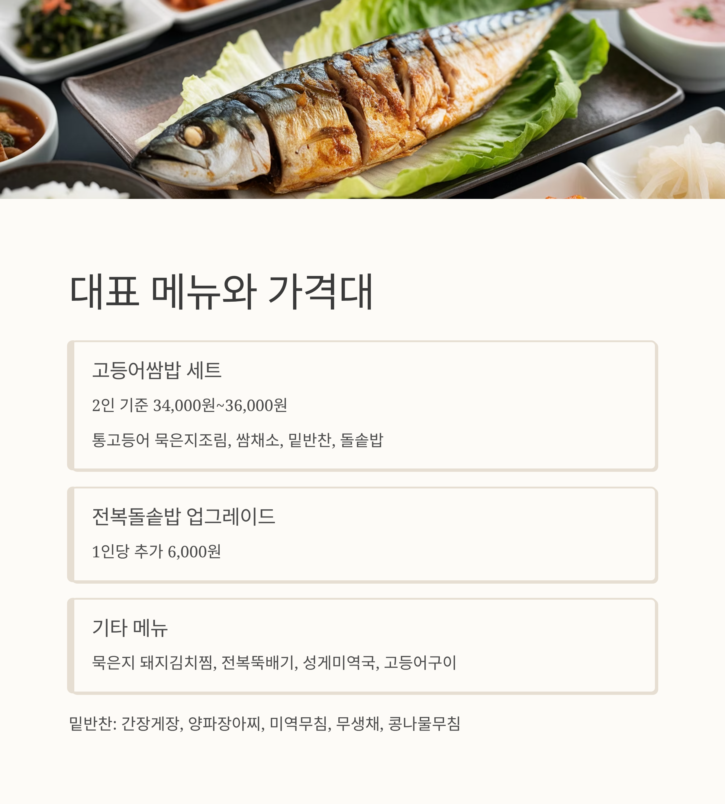 대표 메뉴는 고등어쌈밥 세트다. 2인 기준 3만 4천 원에서 3만 6천 원 선으로, 통고등어 묵은지조림에 쌈채소, 밑반찬, 돌솥밥이 함께 나온다.