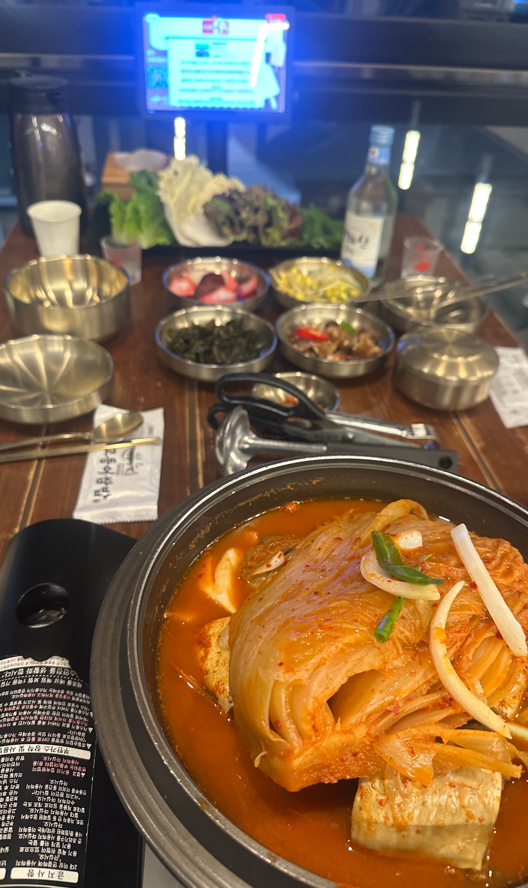 단체 손님을 위한 넓은 테이블이 준비되어 있고, 각 테이블에는 조림을 따뜻하게 유지할 수 있는 버너가 설치되어 있다.