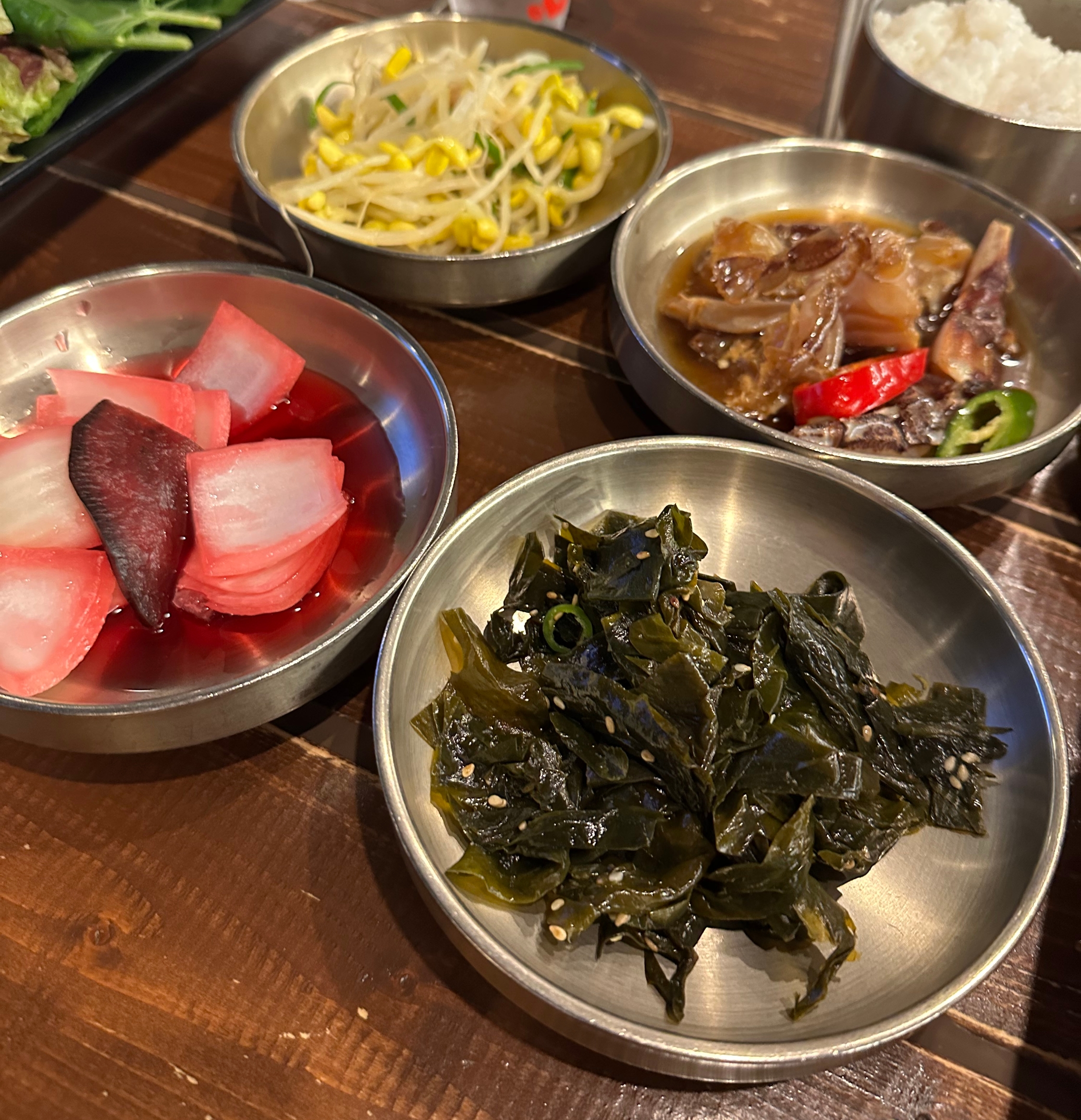 밑반찬은 정갈한 가정식 스타일로, 간장게장, 양파장아찌, 미역무침, 무생채, 콩나물무침 등 한식 밥상처럼 차려진다.