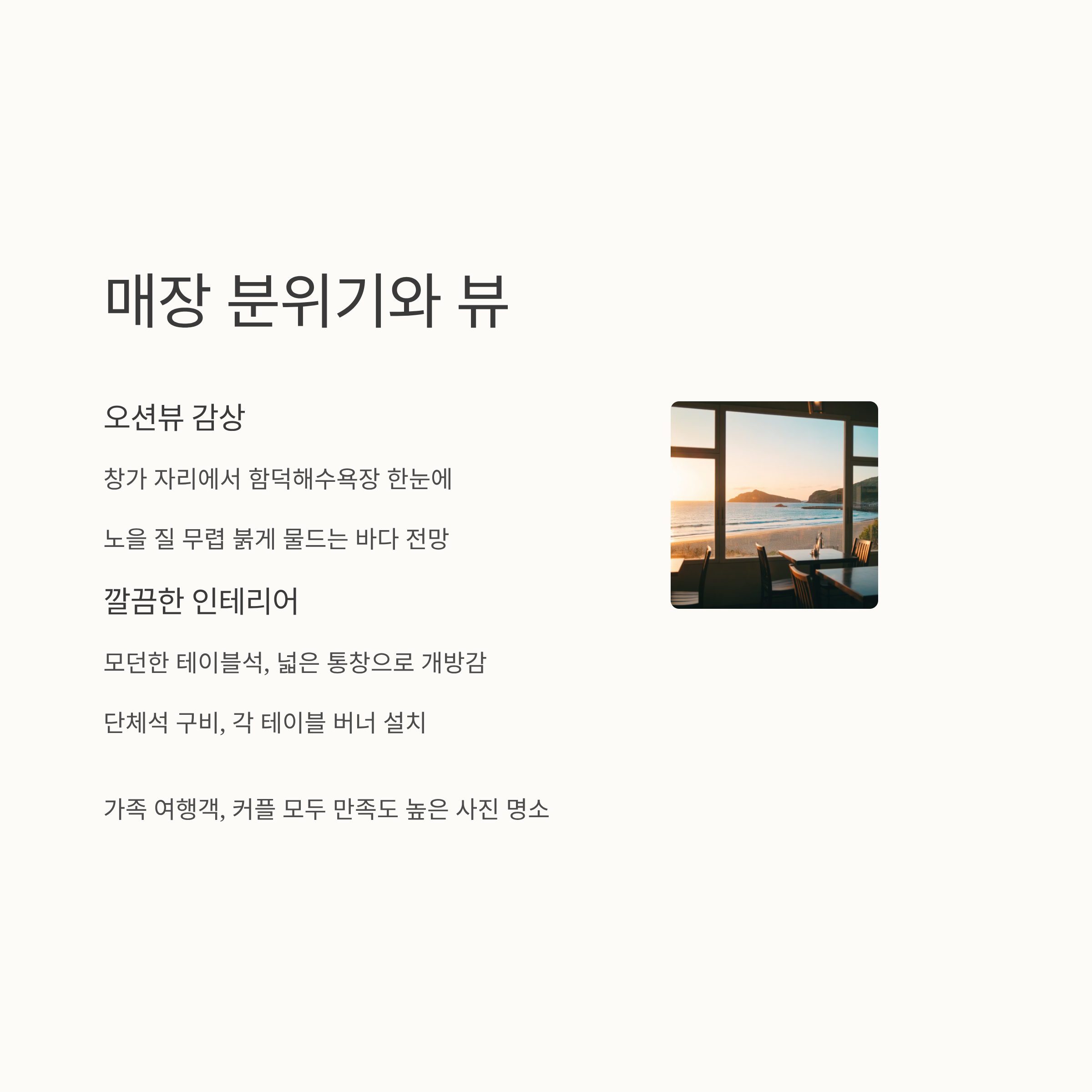 노을 질 무렵 방문하면 창문 너머로 붉게 물드는 바다를 보며 식사할 수 있어 사진 명소로도 손꼽힌다.