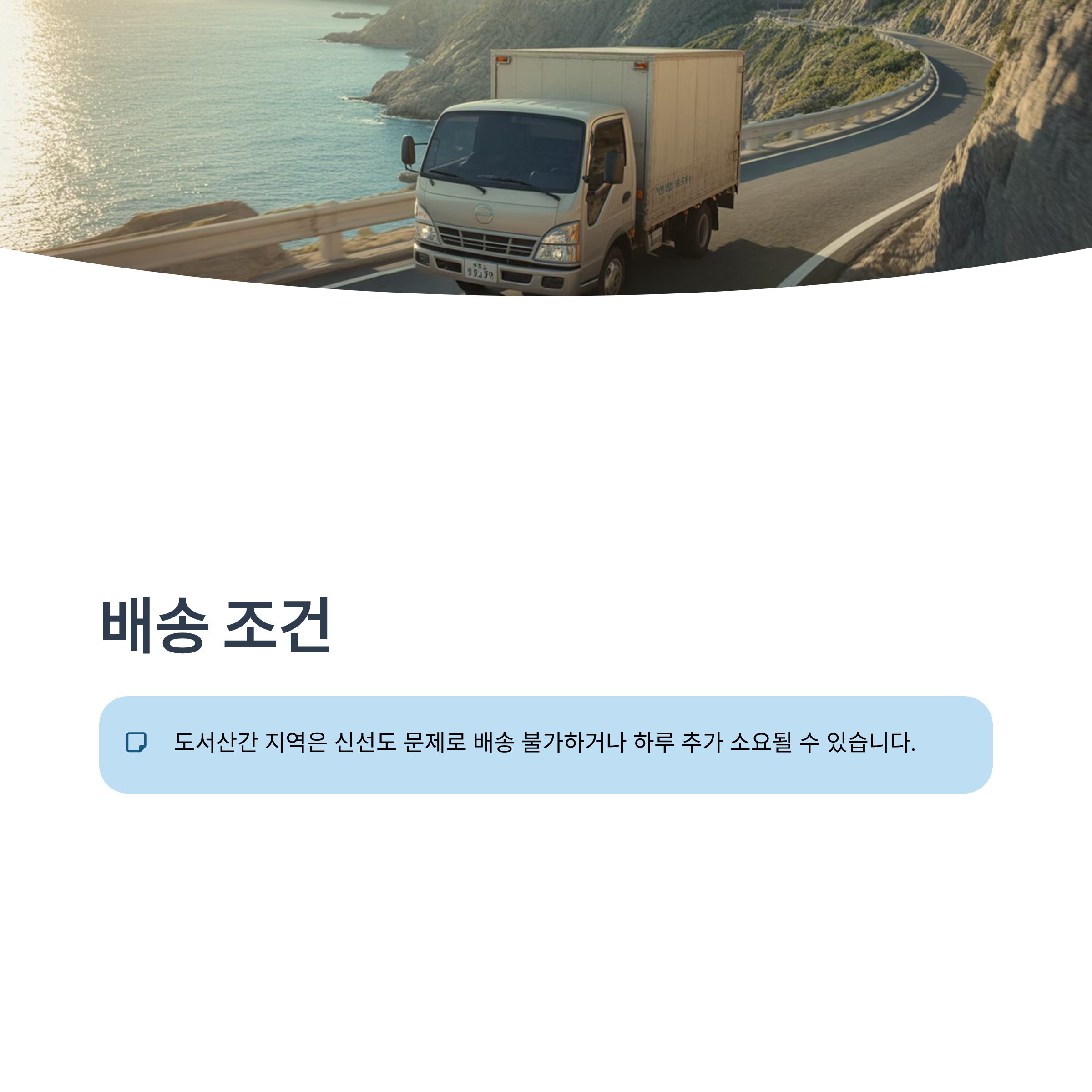 일부 도서산간 지역은 신선도 문제로 배송이 불가하거나 하루 추가 소요될 수 있습니다.
