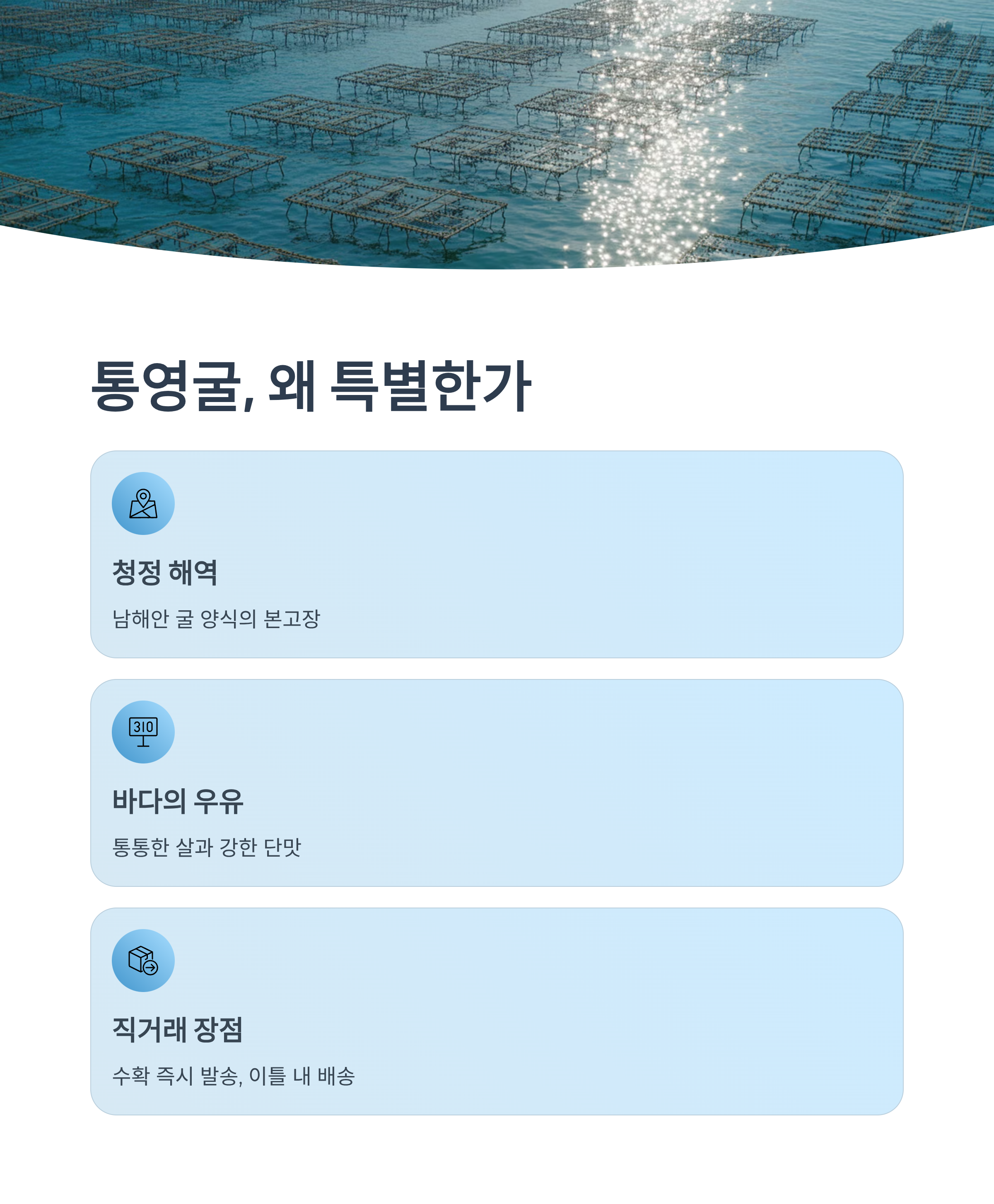 통영은 남해안의 청정 해역으로, 굴 양식의 본고장으로 불립니다.