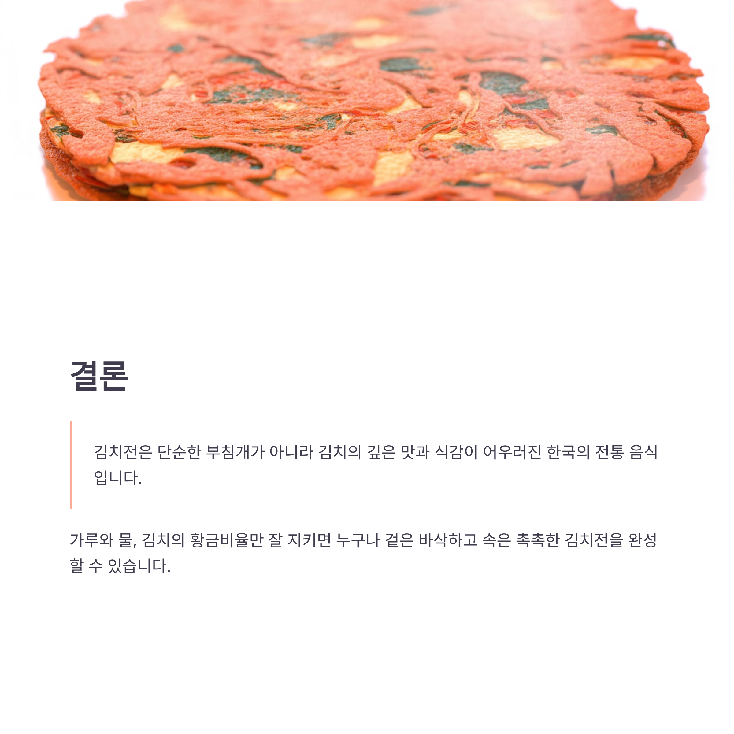겉은 바삭하고 속은 촉촉한 완벽한 김치전을 만들 수 있습니다.